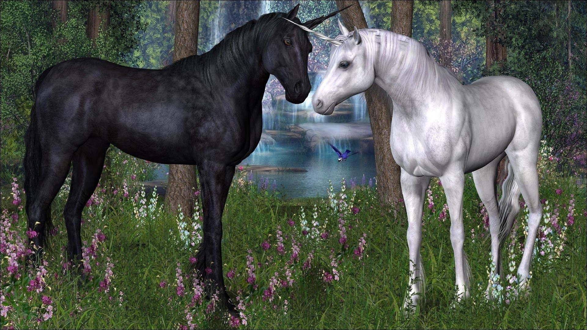 Schwarzes und weißes Einhorn am Waldsee