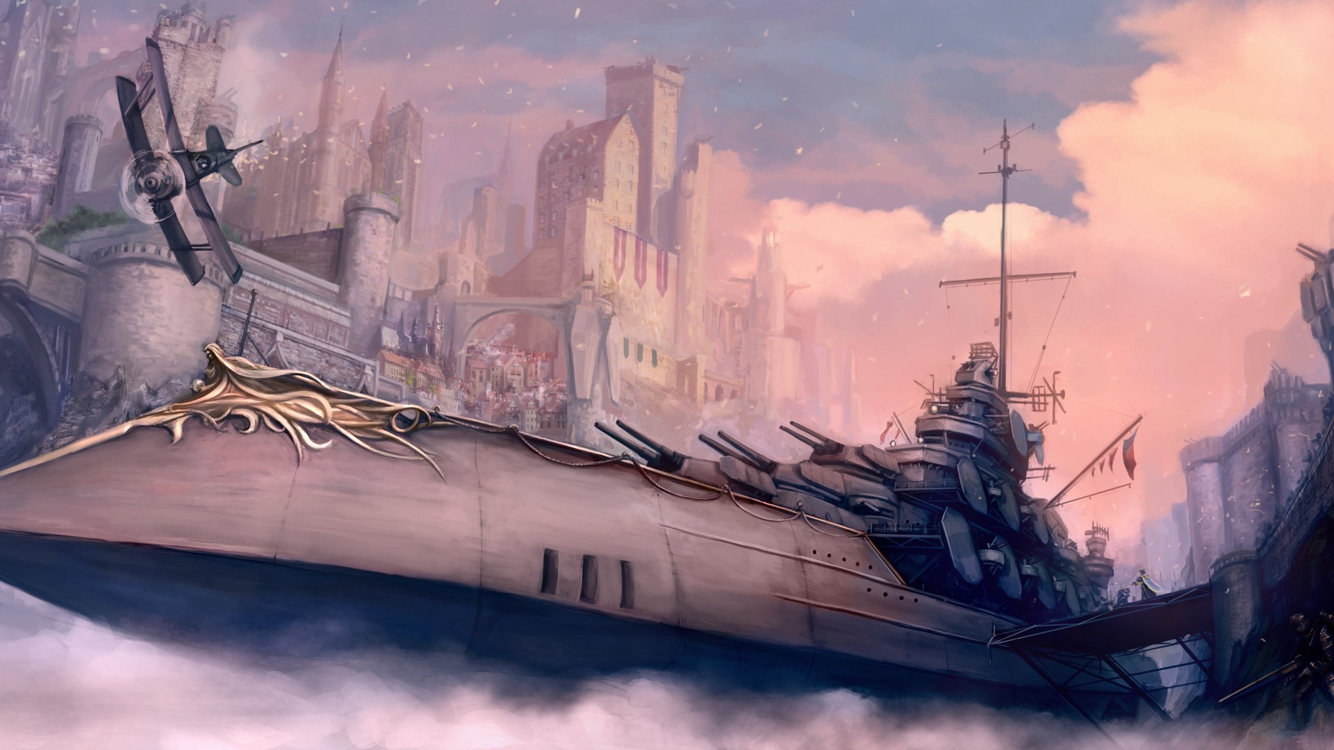 Ein Kriegsschiff, das durch die Fantasy-Stadt fährt