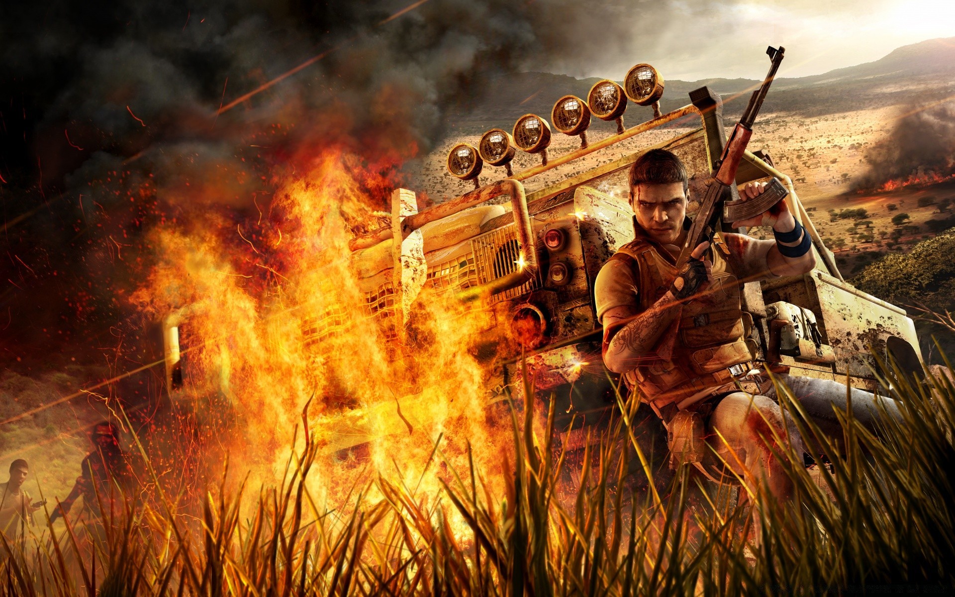 Mann mit Waffe vor dem Hintergrund des Feuers und der afrikanischen Natur