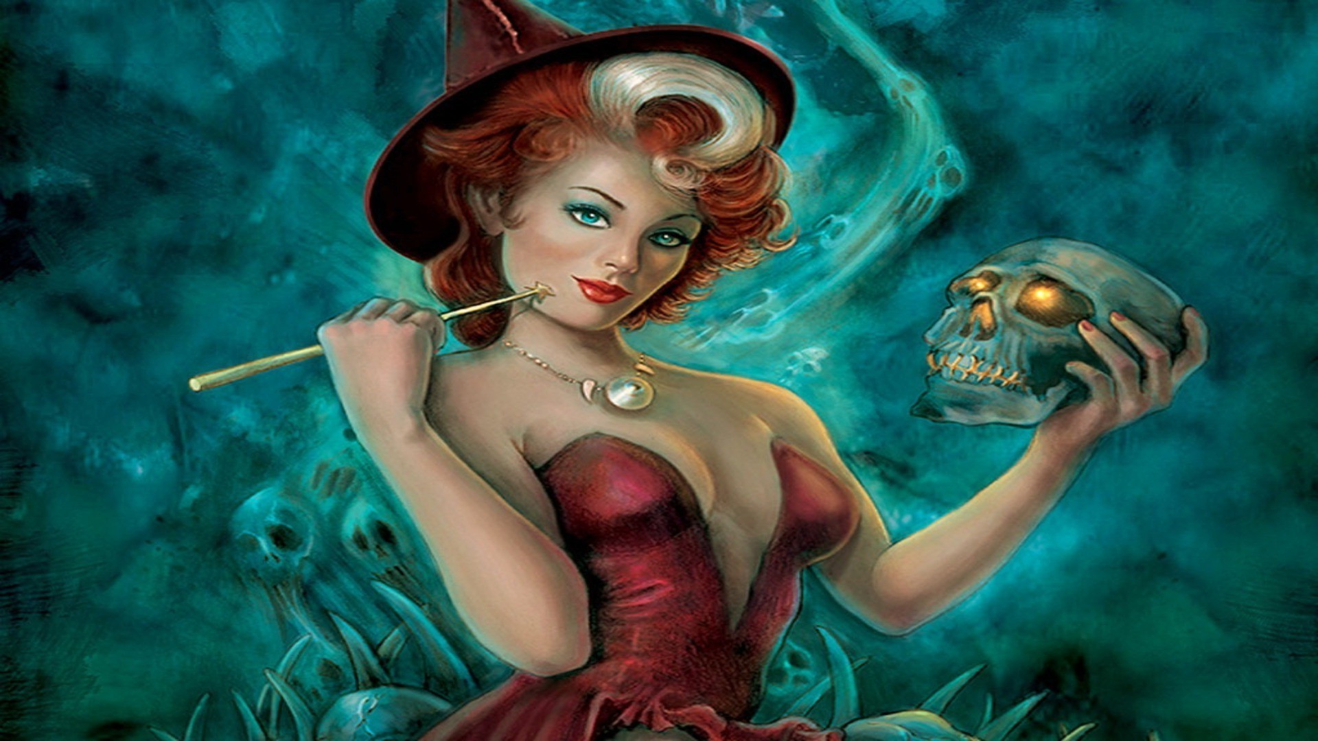 Die Hexe trägt einen Hut mit einem Schädel in der Hand