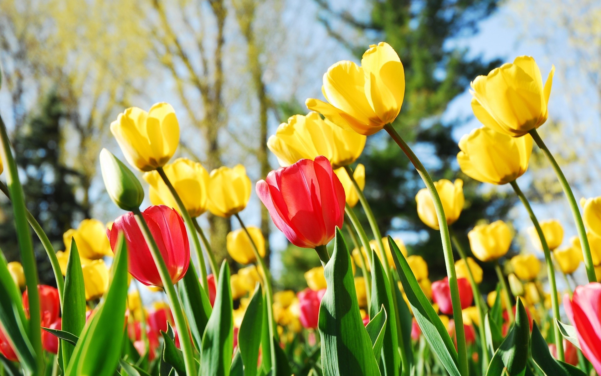 Feld von gelben und roten Tulpen
