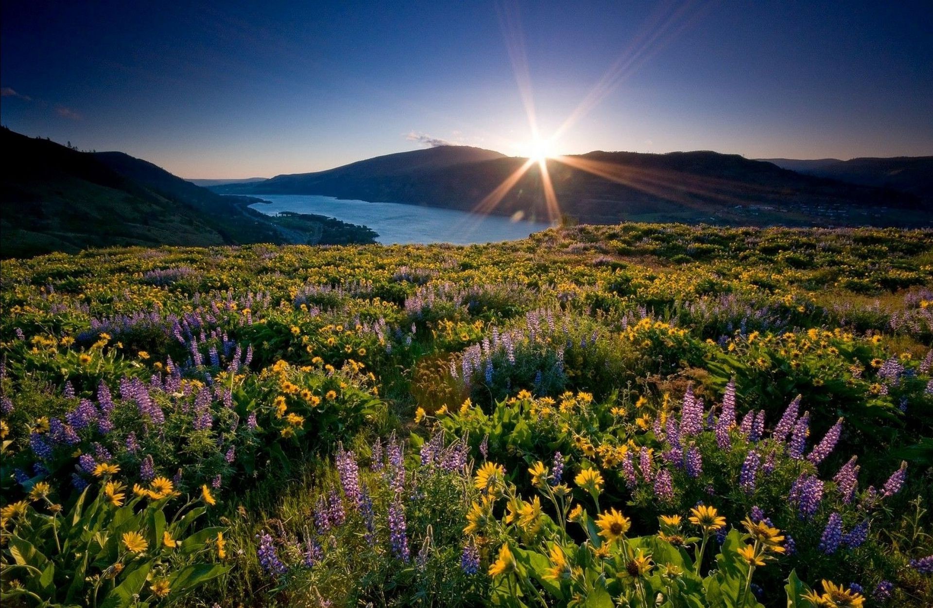 Landschaft der Morgendämmerung in einer Blumenwiese