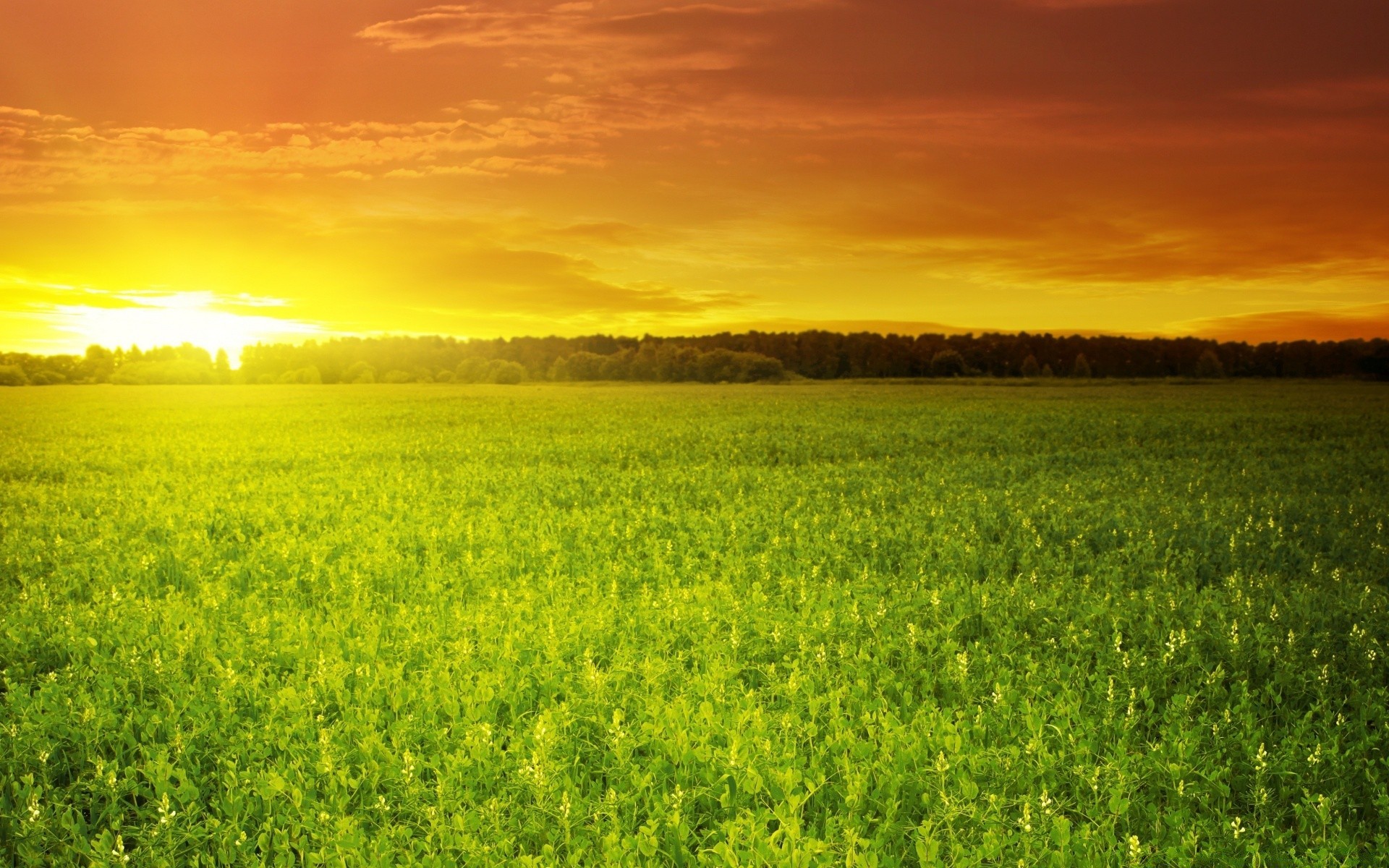 Dunkle Felder und ein Baum in der Ferne vor dem Hintergrund der Sonne