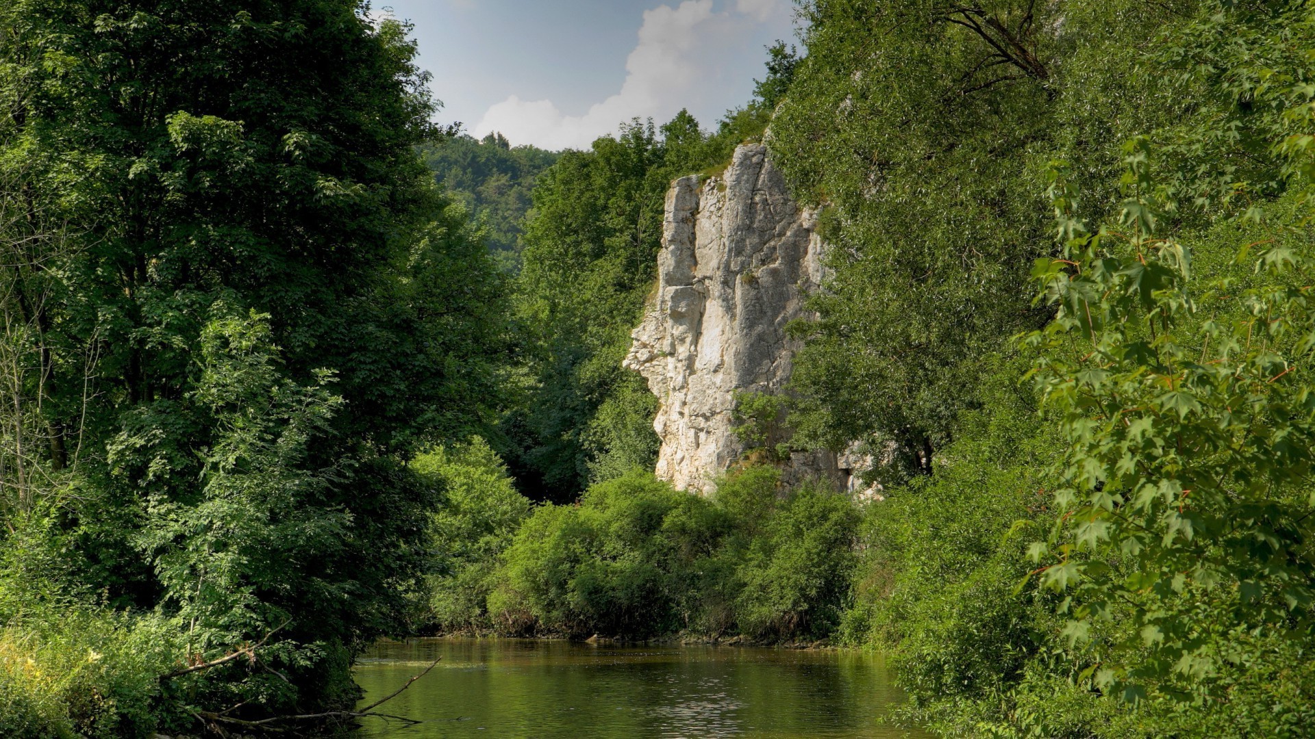 Athlet springt von einem riesigen felsen nach untenAthlet springt von einem riesigen Felsen nach unten