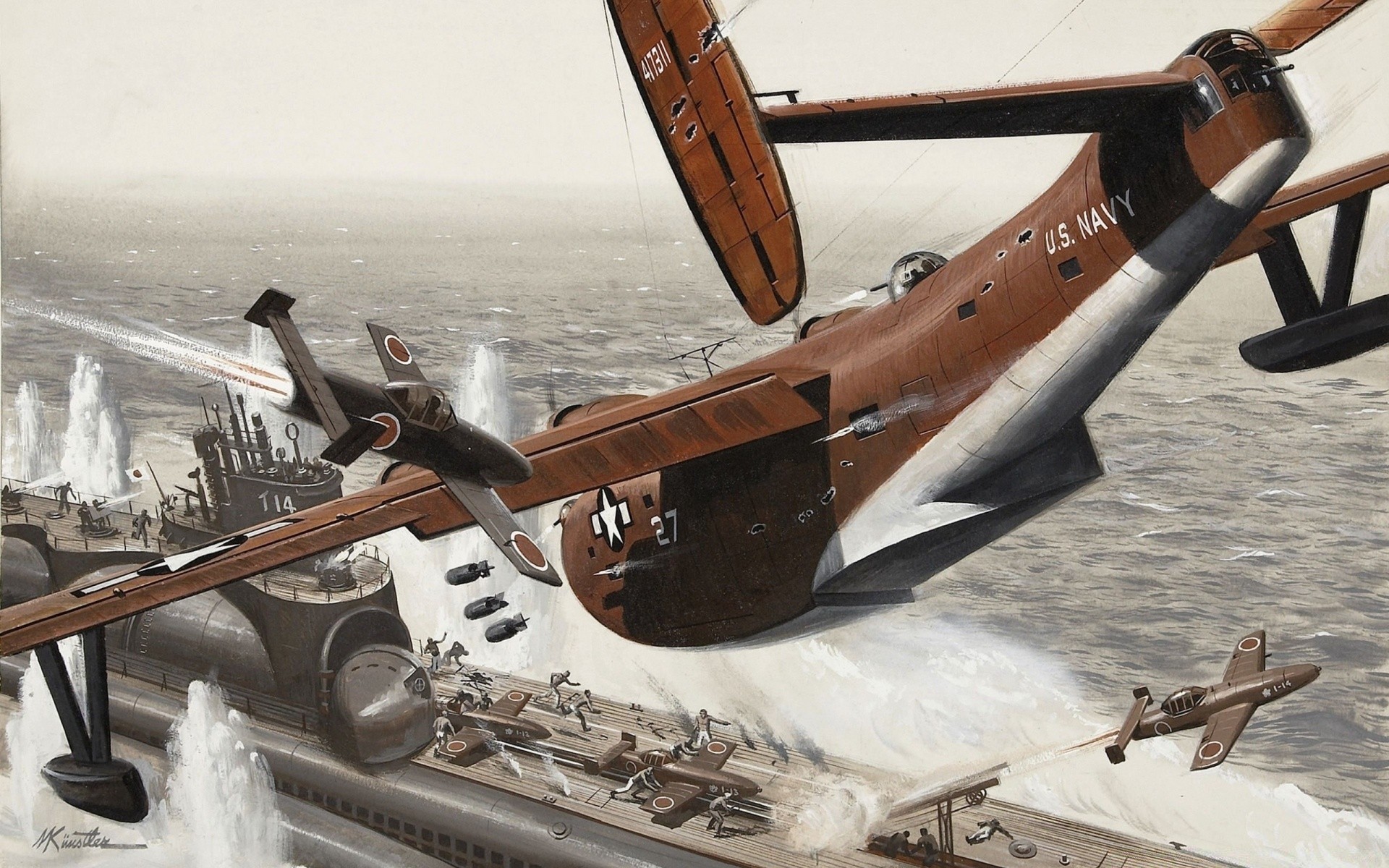 Kriegskampf. zwei flugzeuge und ein schiff. kampf auf dem wasserKriegskampf. Zwei Flugzeuge und ein Schiff. Kampf auf dem Wasser