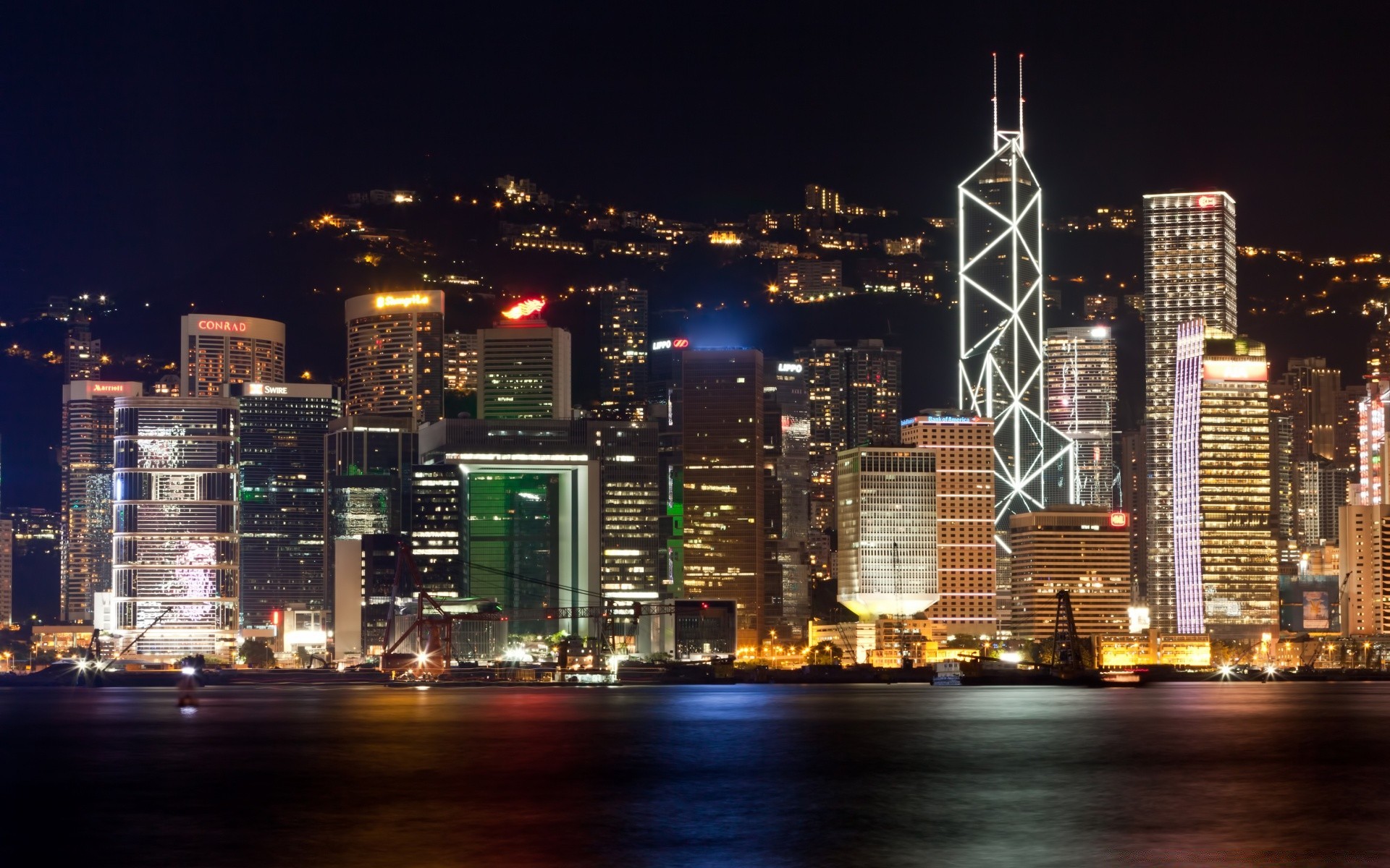 Asiatische Stadt mit einem Wolkenkratzer und einem Teich