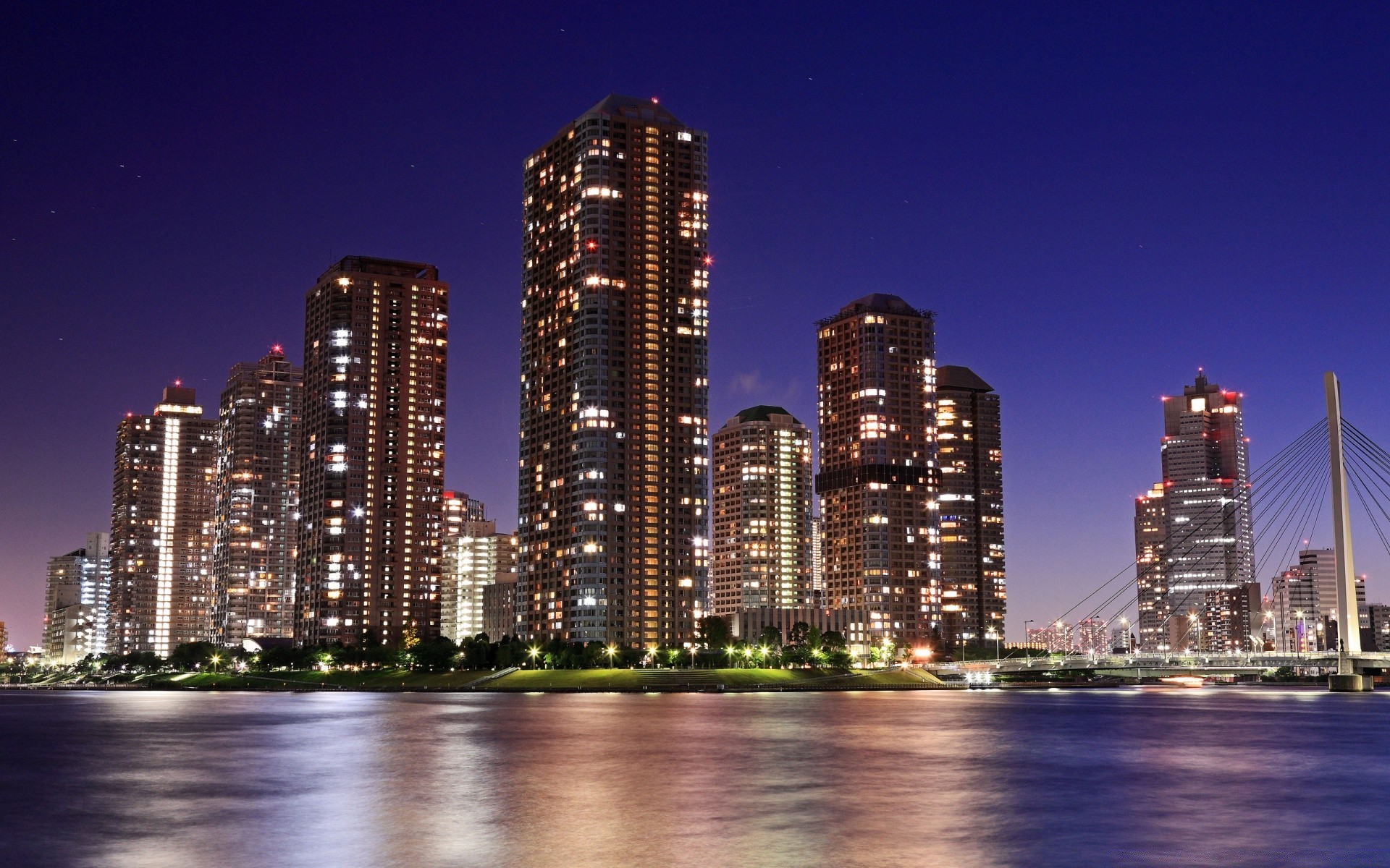 Brücke über den Fluss und helle Wolkenkratzer