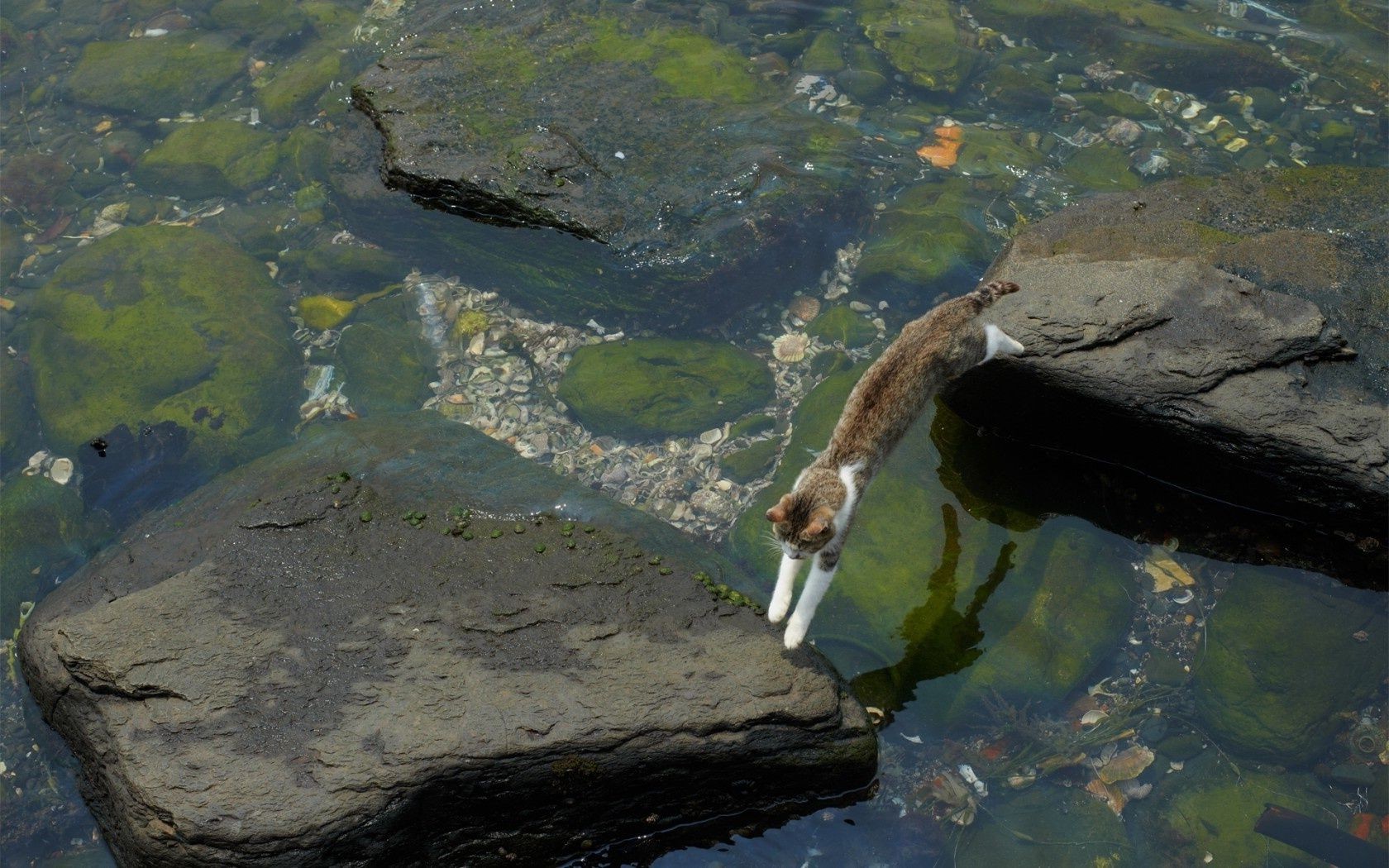 Die Katze wandert entlang der Felsen am Fluss