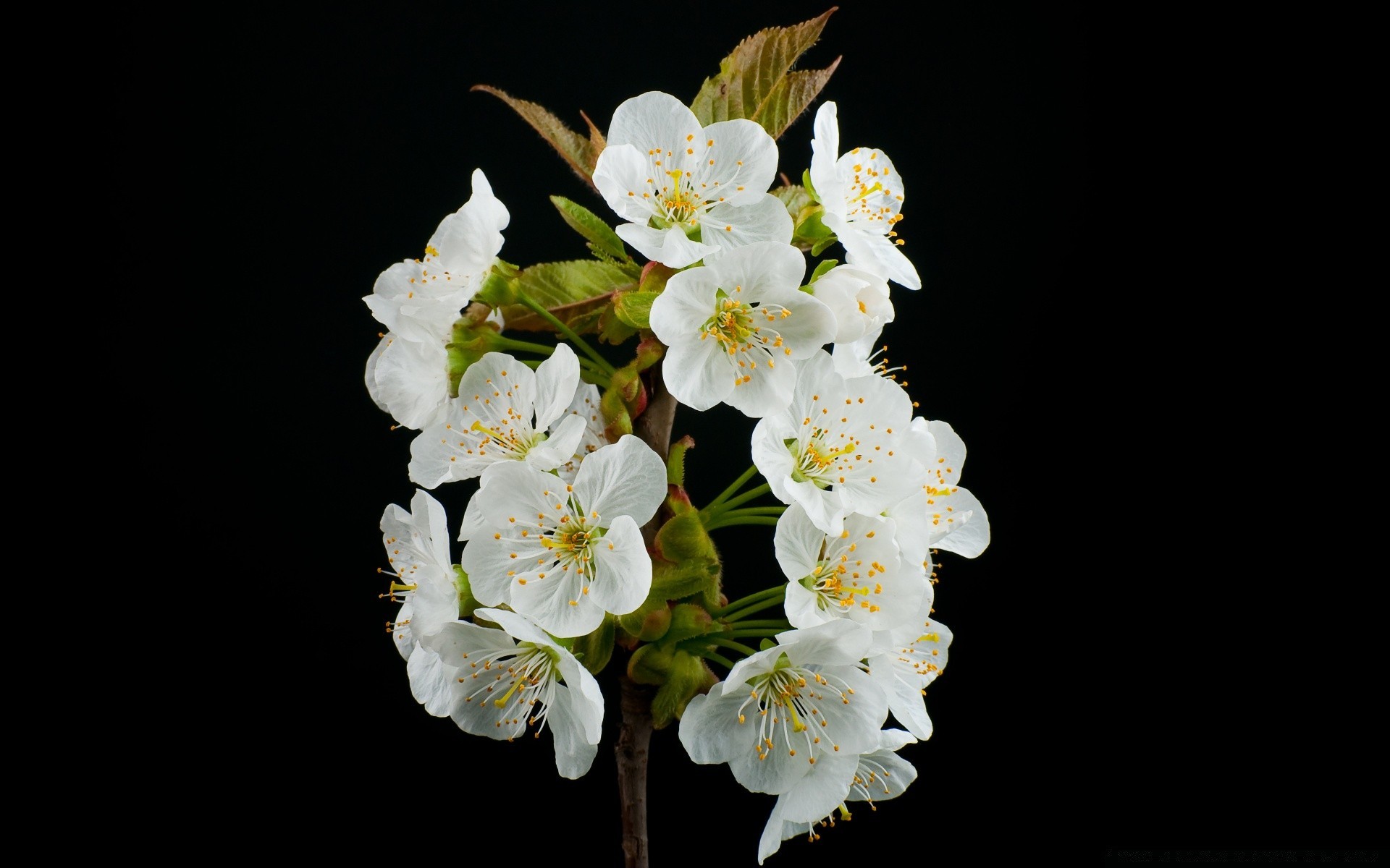 Weiße Blüten mit einer brennenden Mitte auf schwarzem Hintergrund