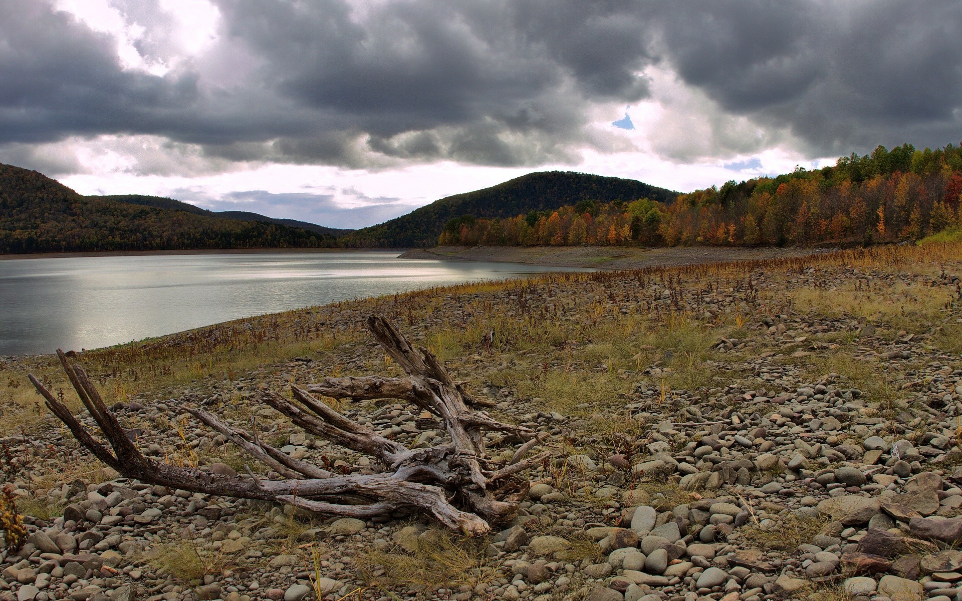 See bei bewölktem Wetter. Landschaft des Sees und der Bäume