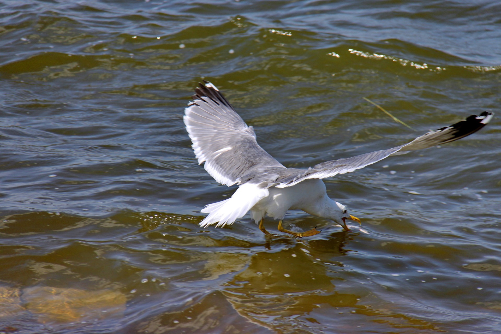 Ein heller weiß-orangefarbener Hubschrauber schwebte in der Luft