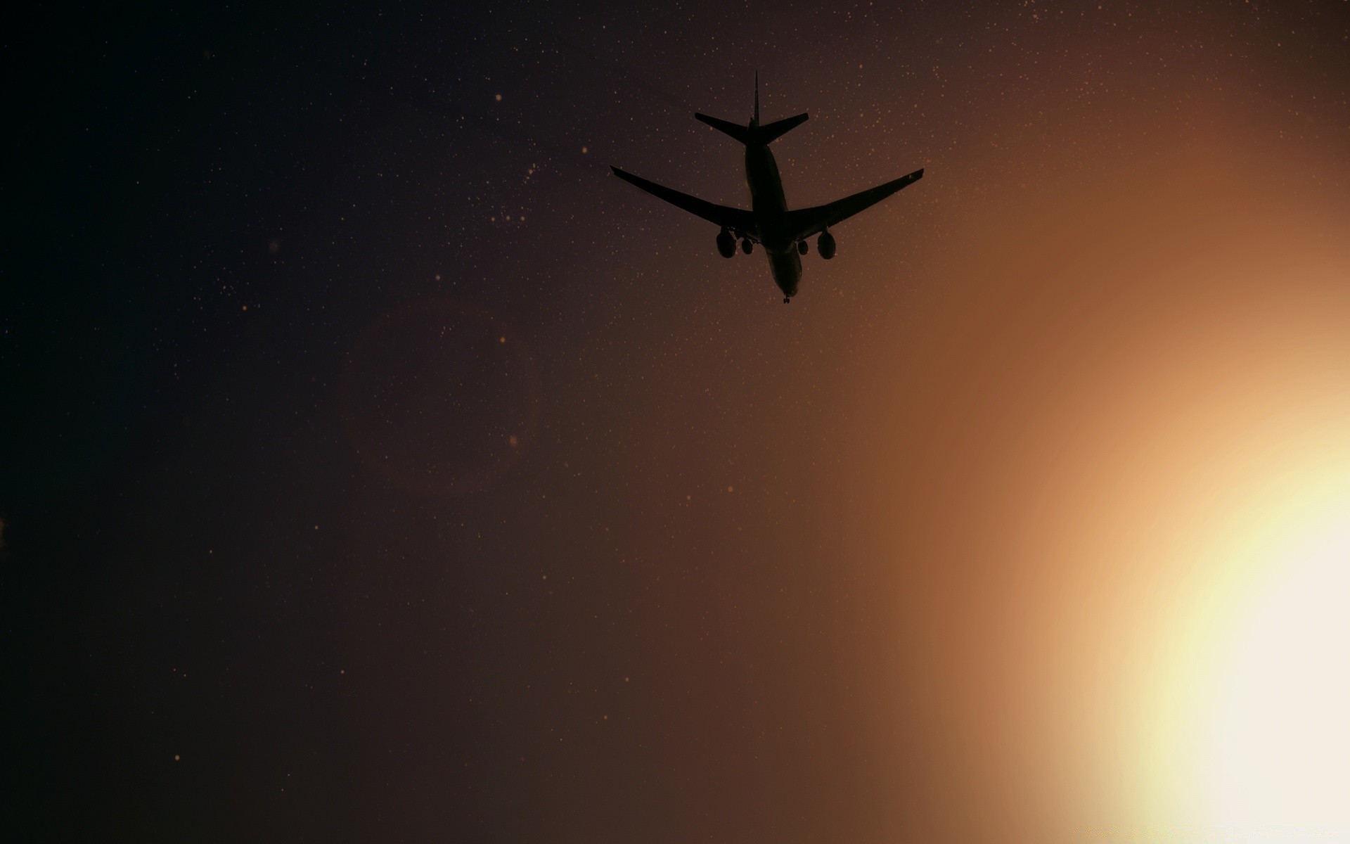 Flugzeug, das in einem hellen sonnenuntergang abfährtFlugzeug, das in einem hellen Sonnenuntergang abfährt