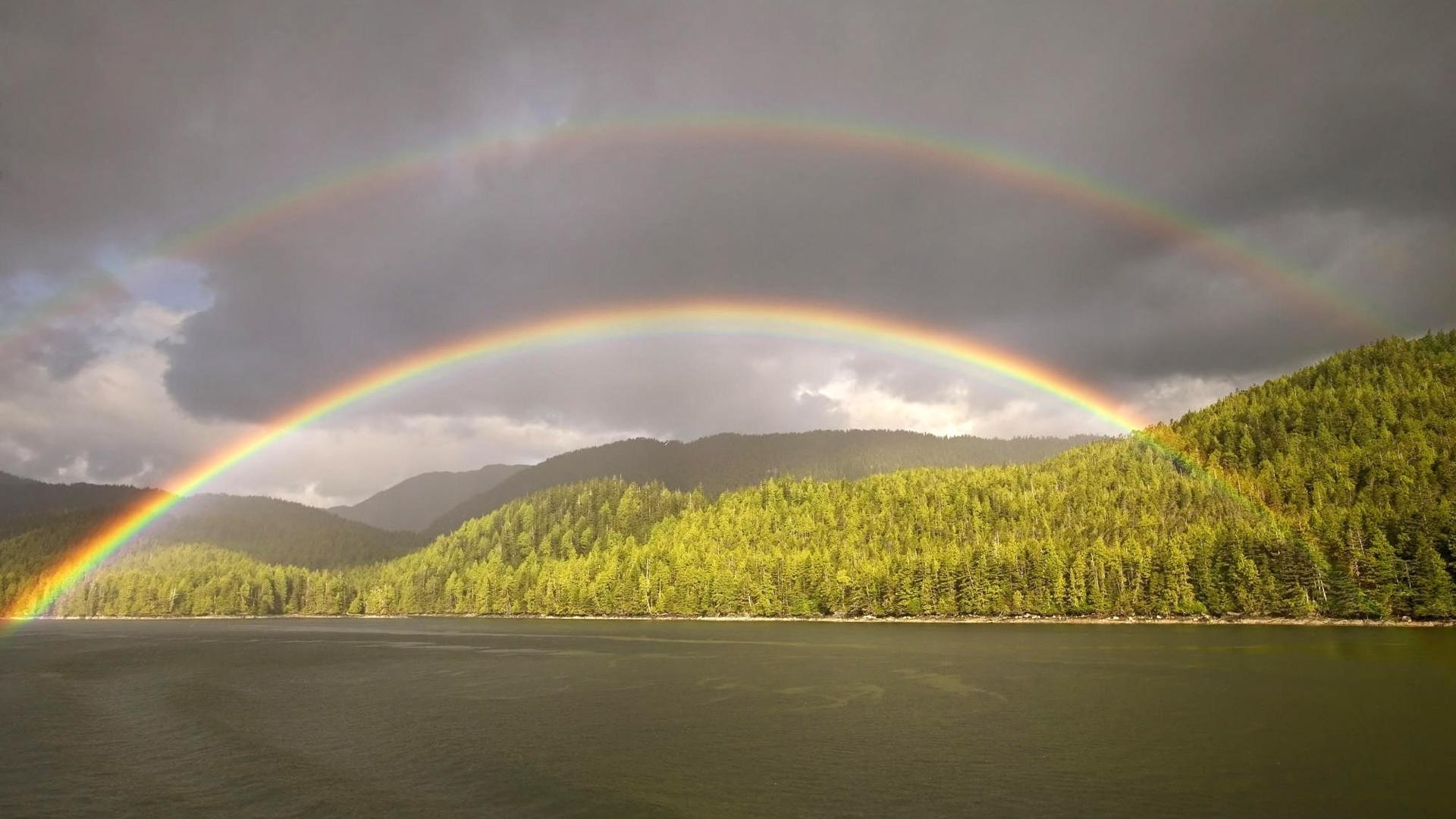 Doppelter Regenbogen über dem Fluss. Grüne Ufer