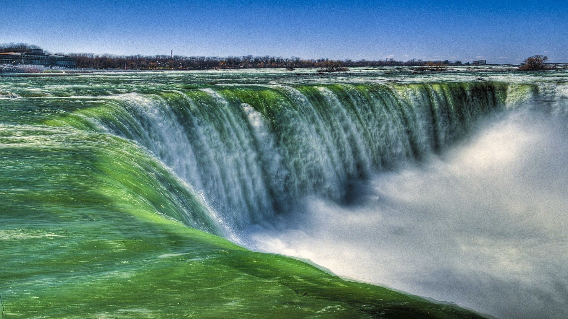 Ein Fluss mit einem grünen Farbton und einem Wasserfall