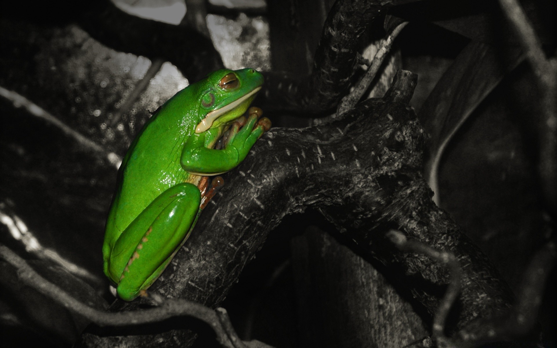 Ein Frosch, der auf einem grünen Blatt sitzt