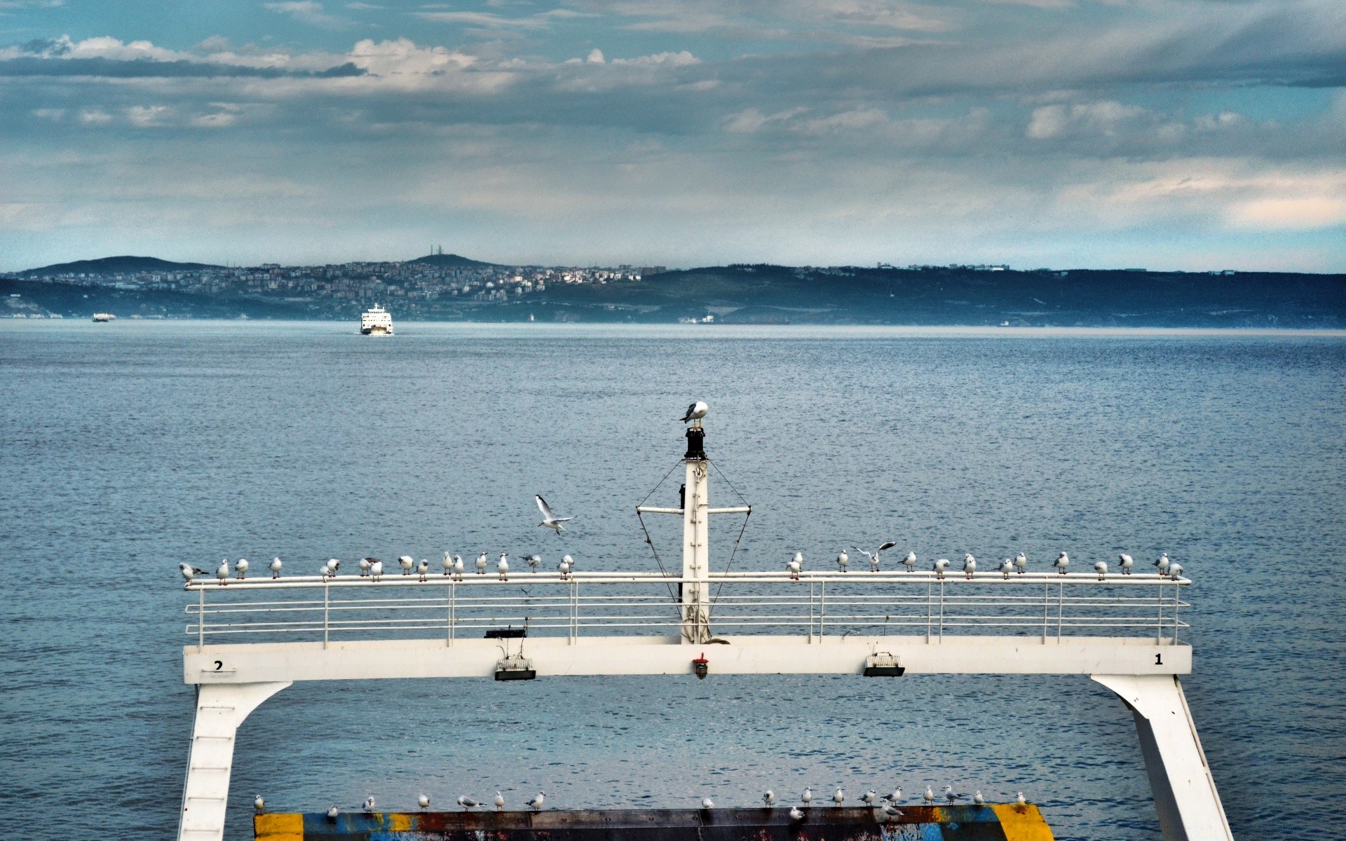 Foto des Meeres von einem Schiff mit Bergen im Hintergrund