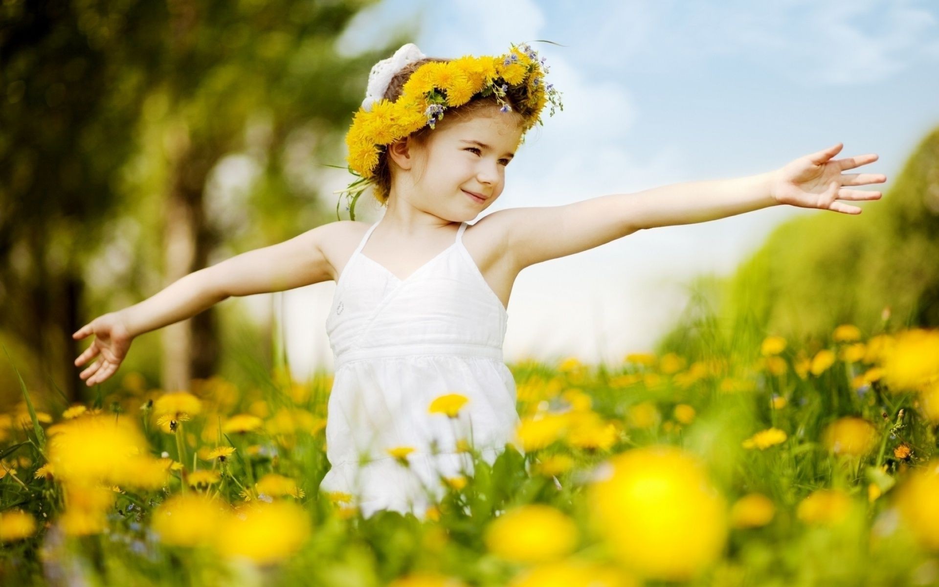 Mädchen in einem Löwenzahnkranz auf einem Feld
