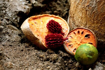 Vergrößertes bild eines wassertröpfchens auf einer fruchtVergrößertes Bild eines Wassertröpfchens auf einer Frucht