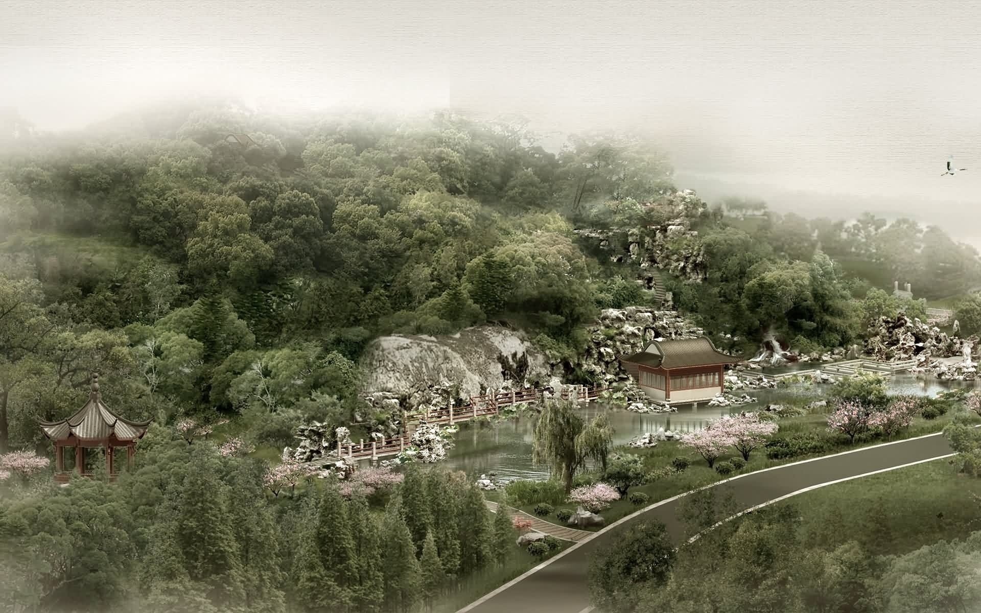 Nebliger japanischer Garten an der Straße