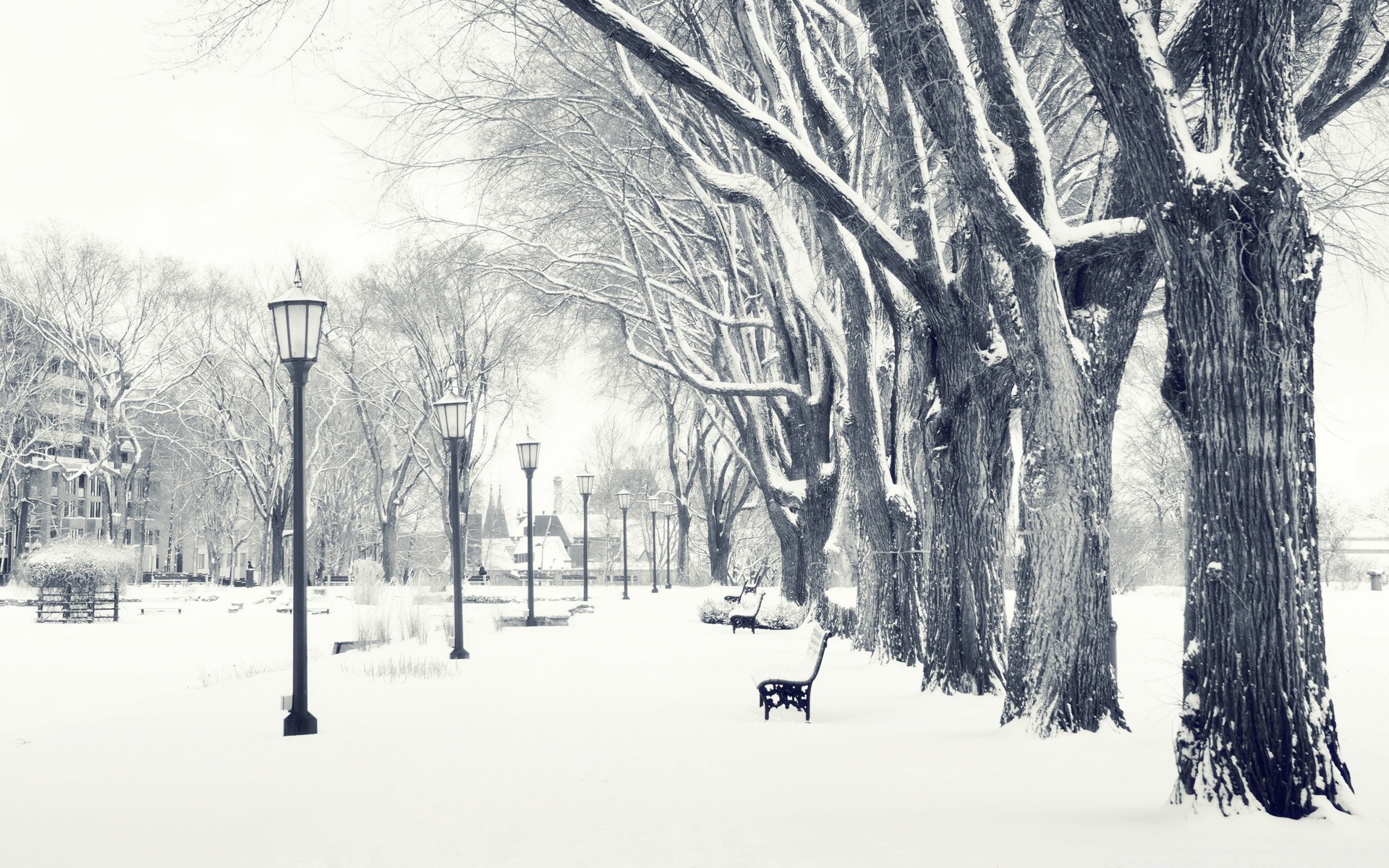 Eine Allee von Bäumen mit Bänken und Laternen im Winter
