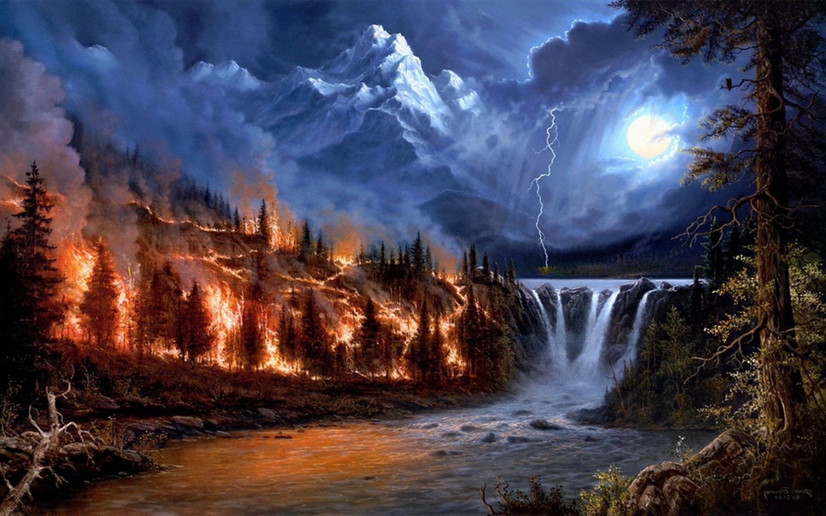 Wasserfall am brennenden Wald in der Nacht