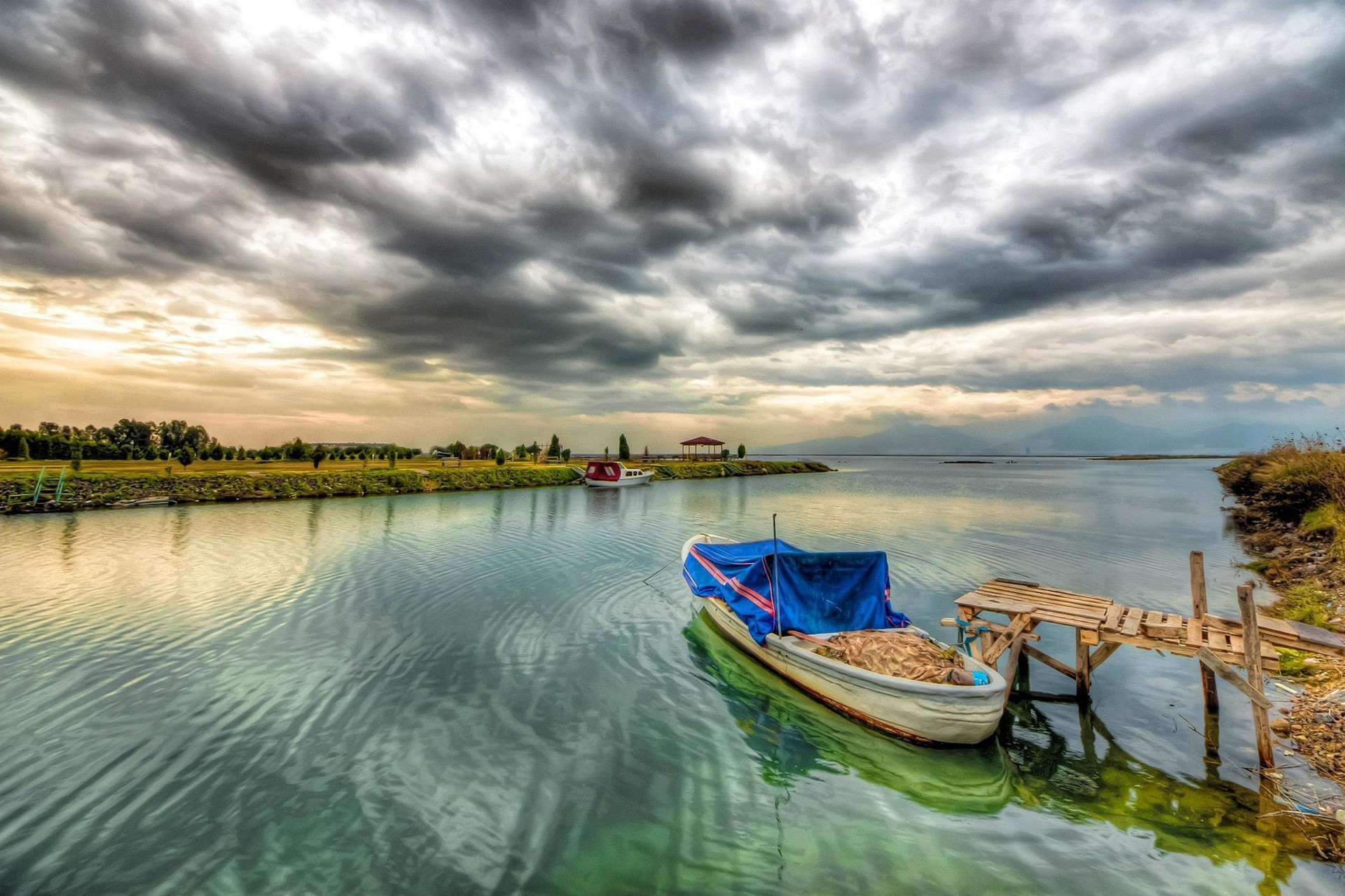 Boot am Steg auf einem großen Fluss