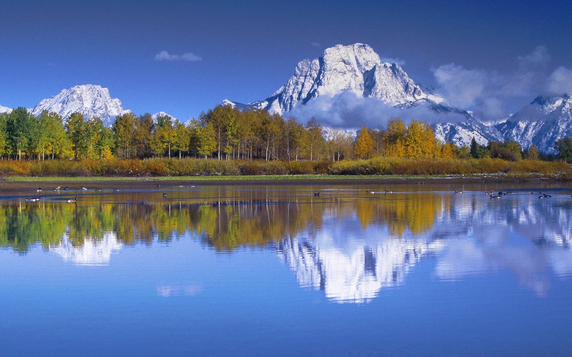 Die Spiegelfläche des Sees spiegelt den Himmel, die Berggipfel und die Bäume wider