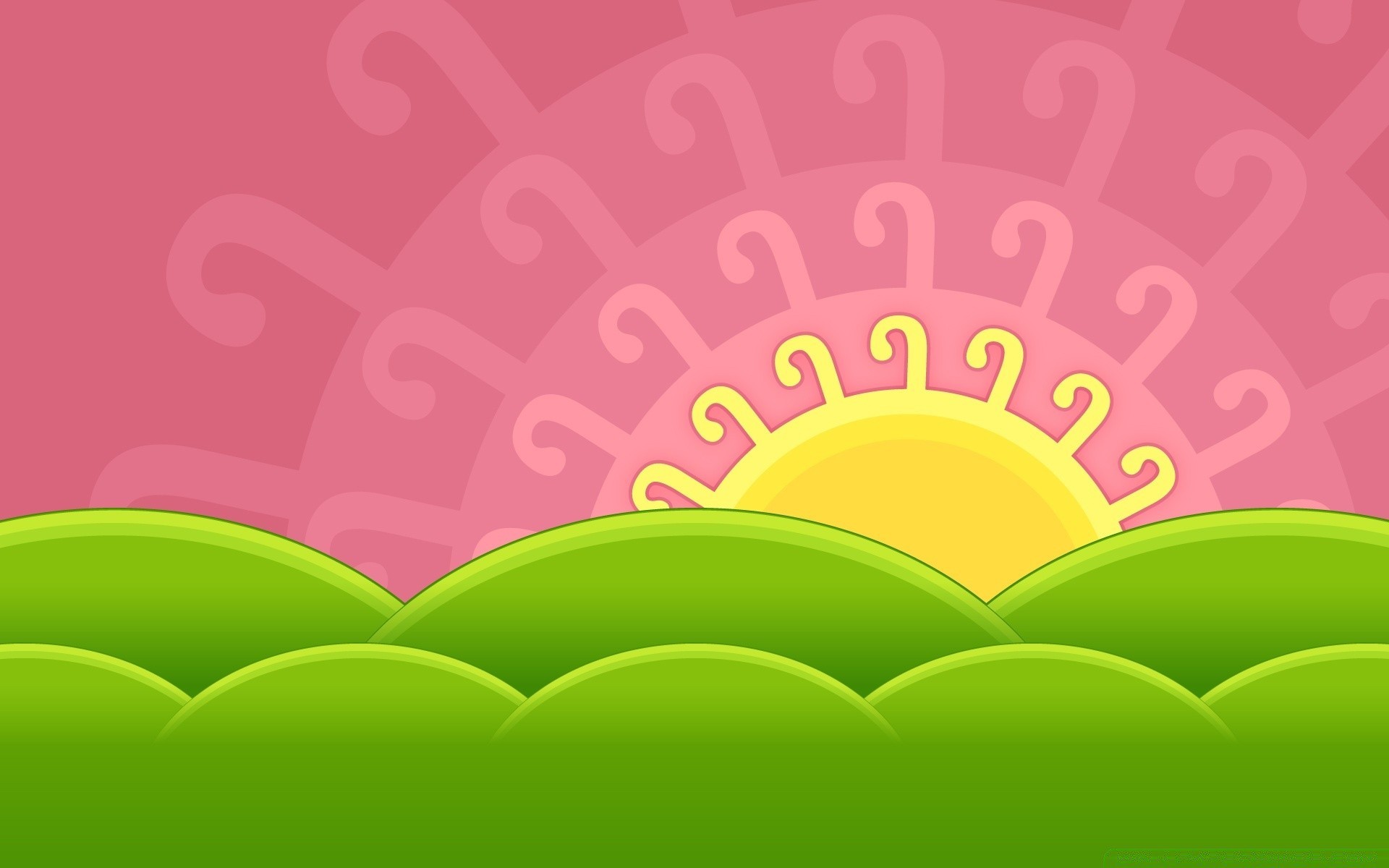 Gelbe Sonne am rosa Himmel auf grünen Wiesen