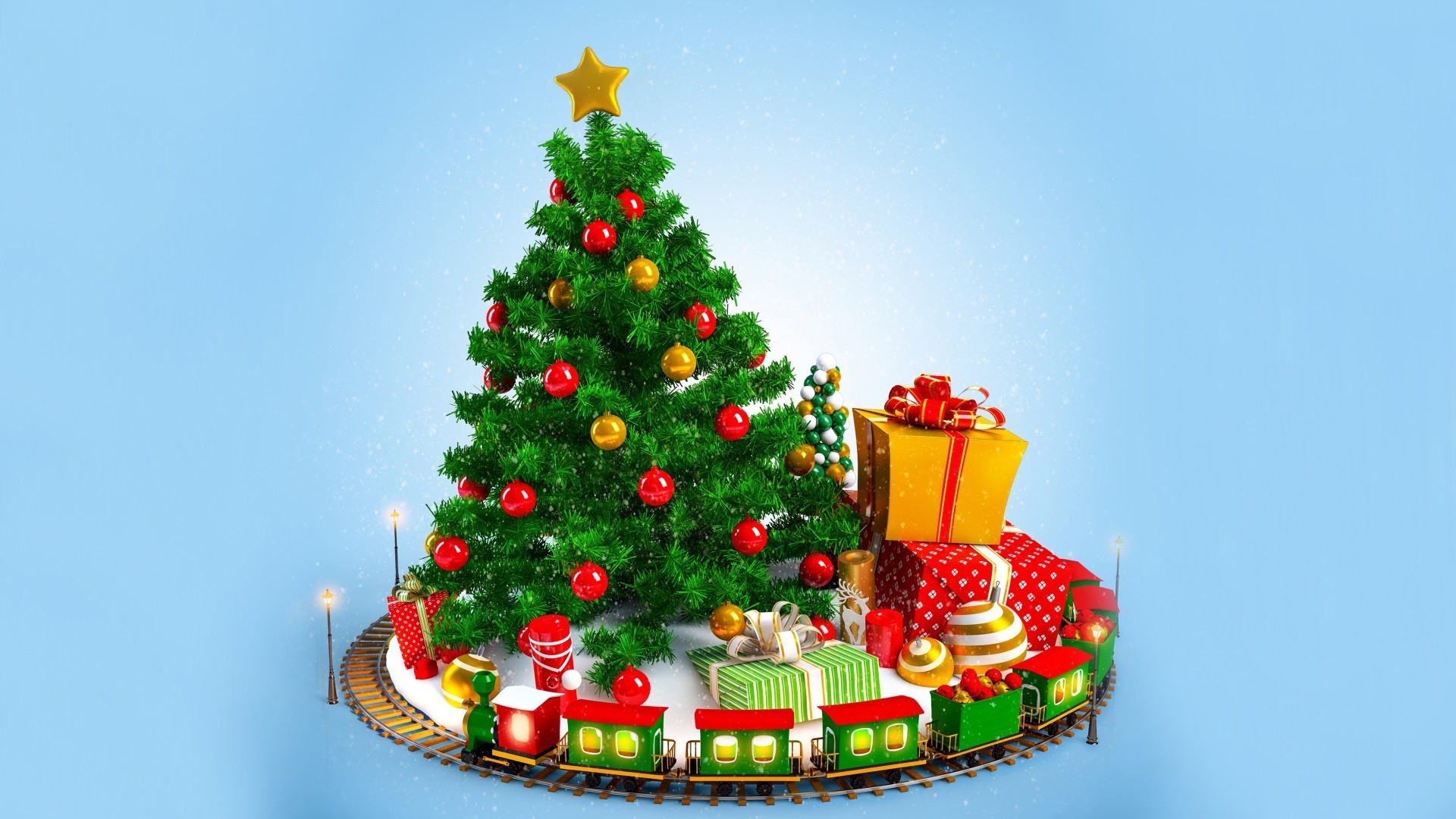 Der Zug fährt um den schicken Weihnachtsbaum herum