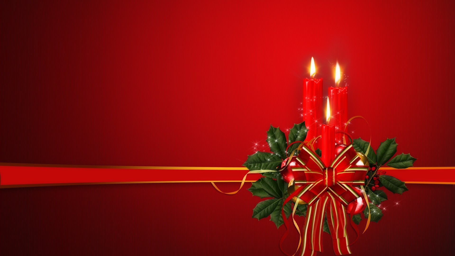 Drei rote Kerzen, verziert mit einer Geschenkschleife und Tannenzweigen