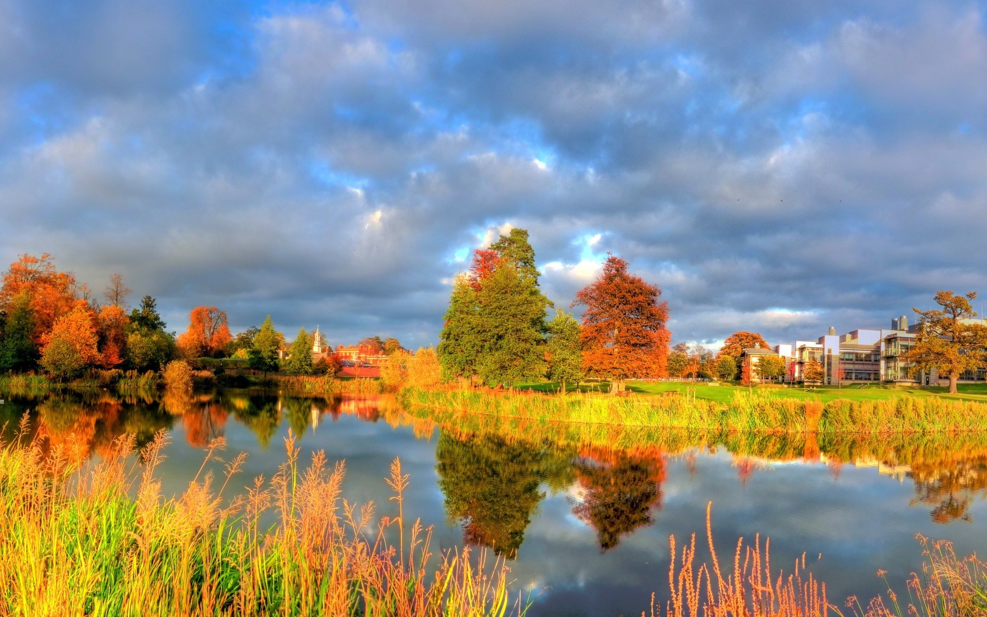 Herbstlandschaft von bunten Bäumen, die sich in der Oberfläche des Flusses widerspiegeln