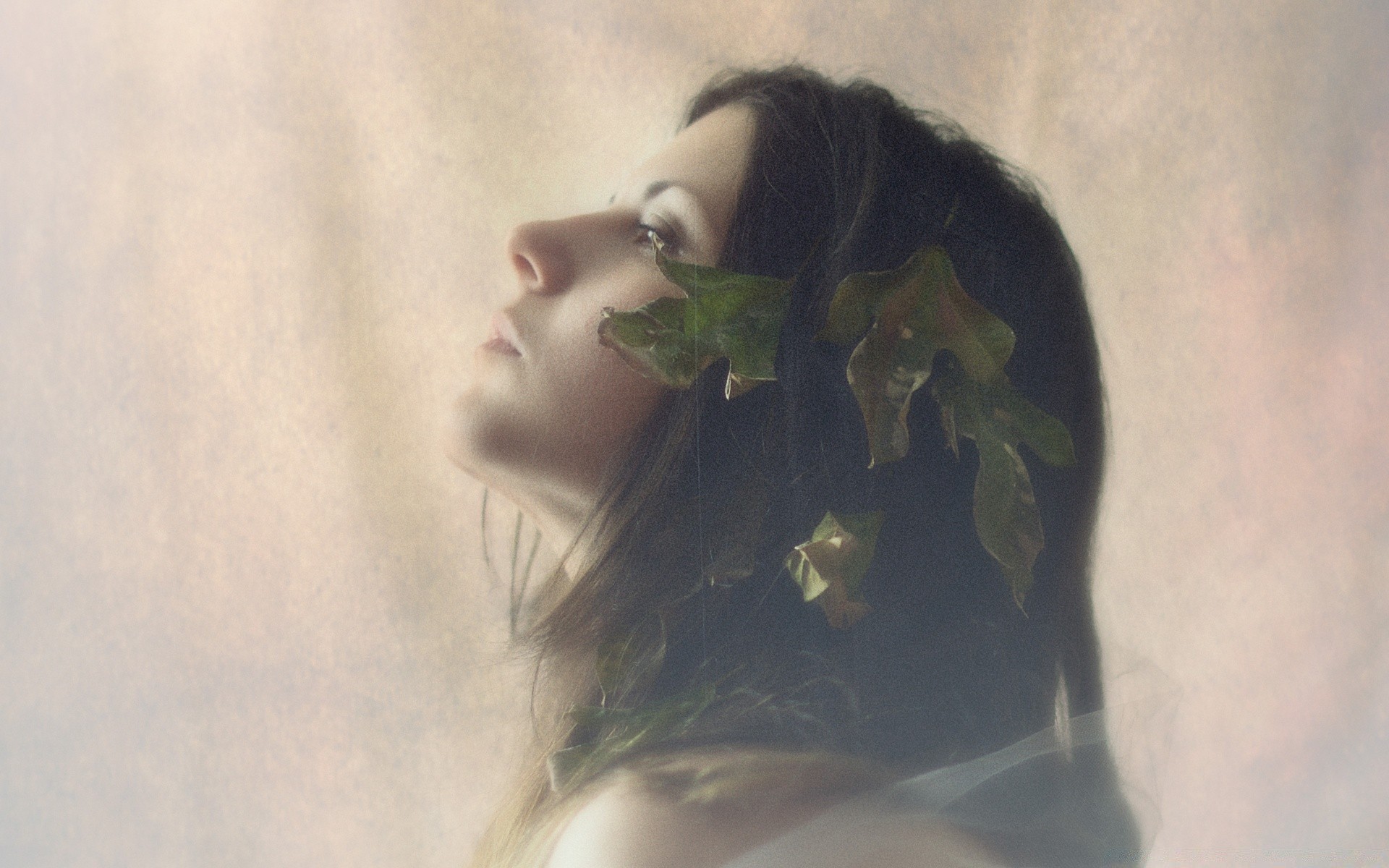Frau mit Blättern am Haar