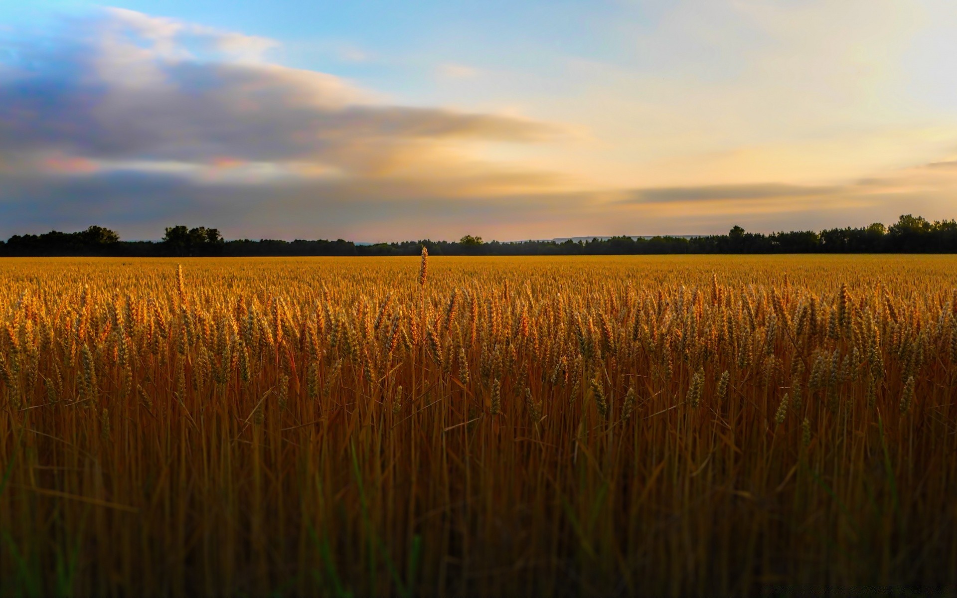 Die Ähren eines Weizenfeldes unter blauem Himmel