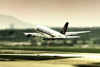 Flugzeug, das vom flughafen auf verschwommenem hintergrund abhebtFlugzeug, das vom Flughafen auf verschwommenem Hintergrund abhebt