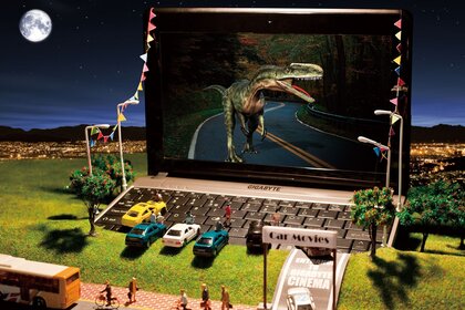 Dinosaurier auf der Leinwand eines Straßenkinos