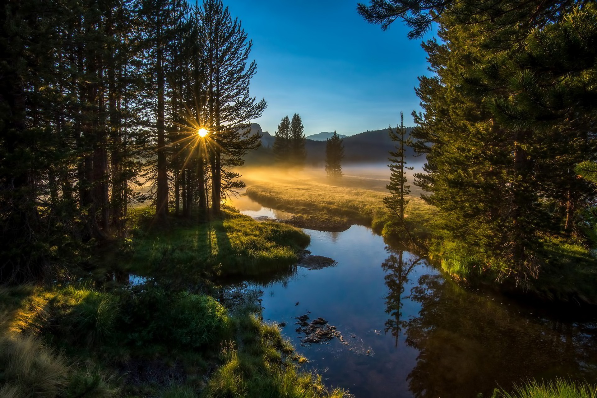 Ein ruhiger Waldfluss inmitten eines Nadelwaldes