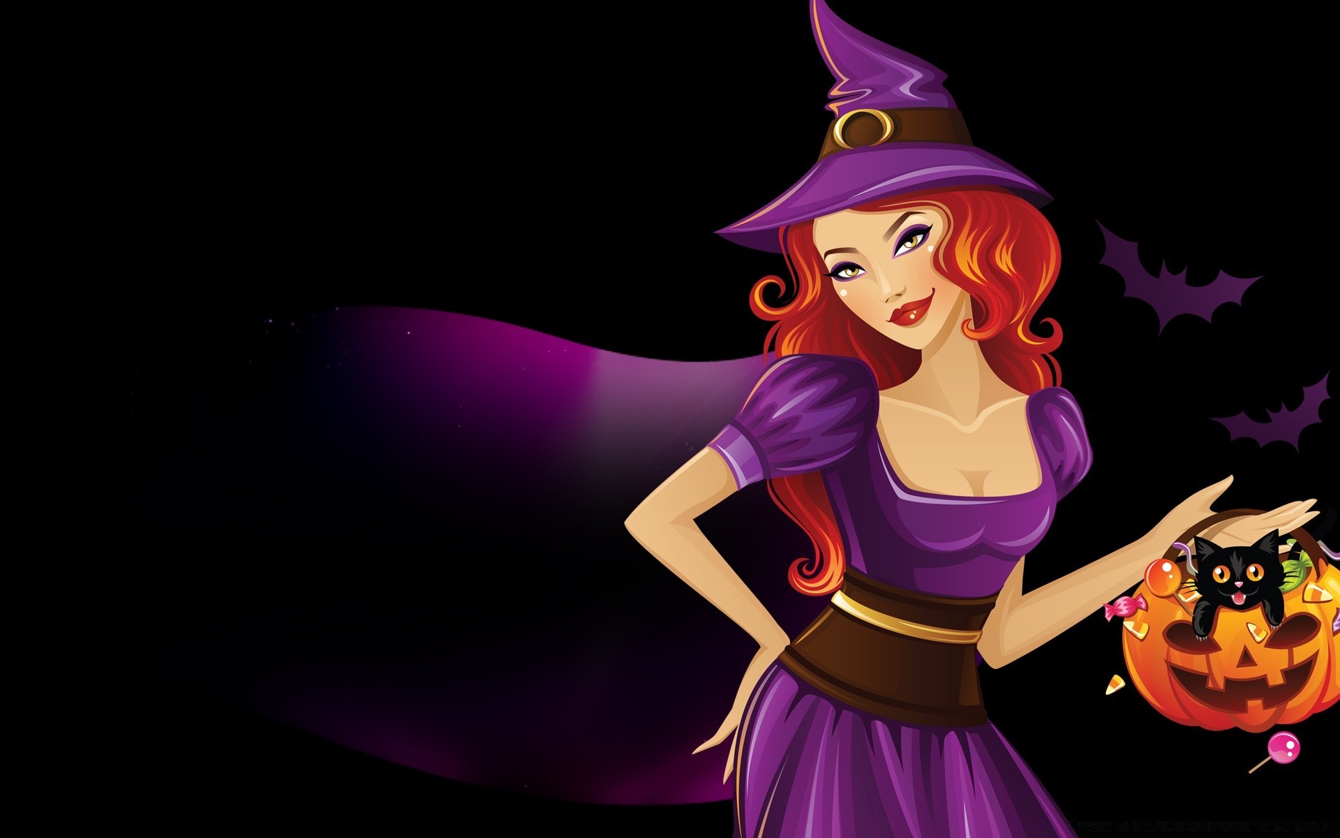 Mädchen im Hexenkostüm auf schwarzem Hintergrund