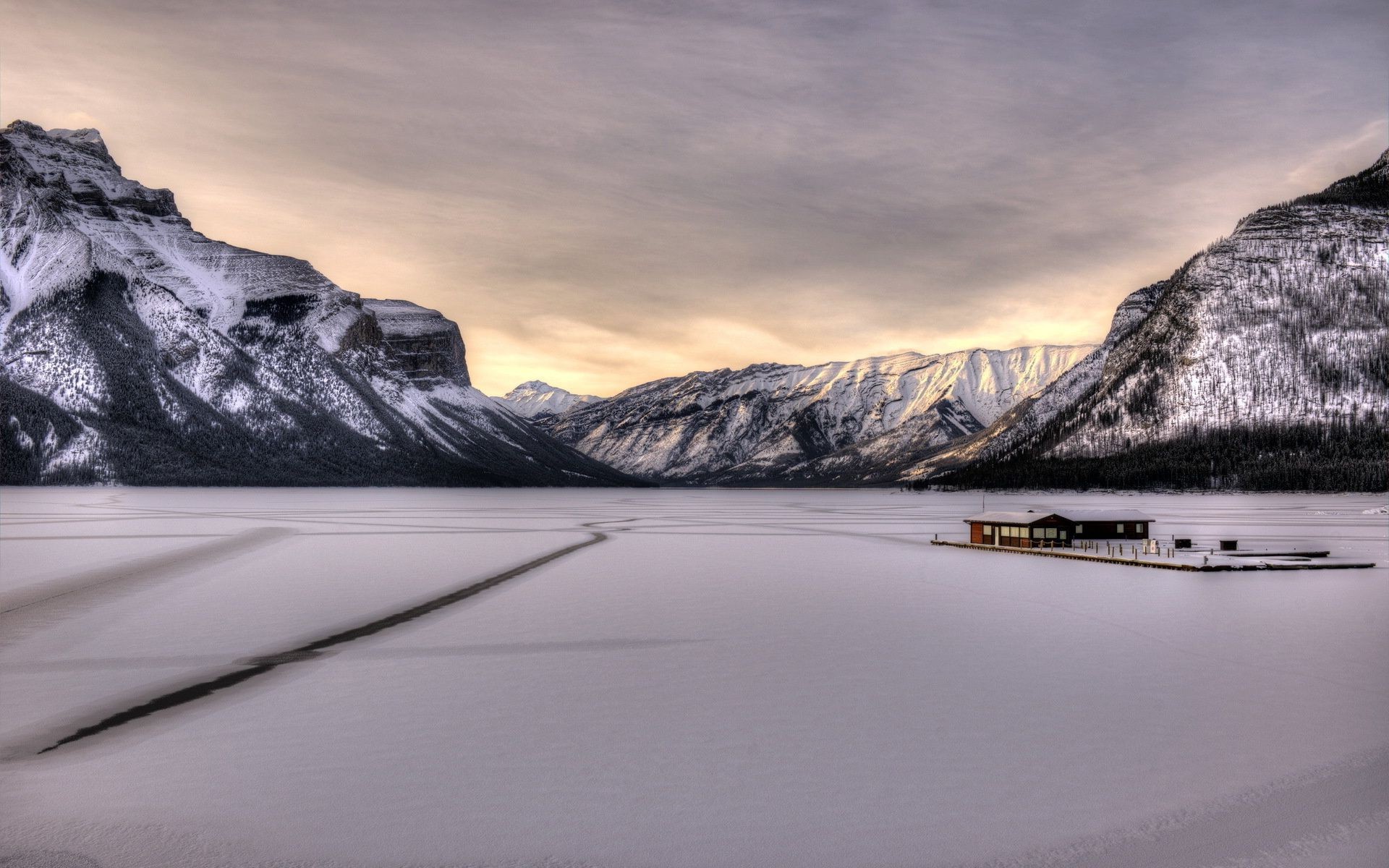 Ein einsames Haus in den schneebedeckten Bergen