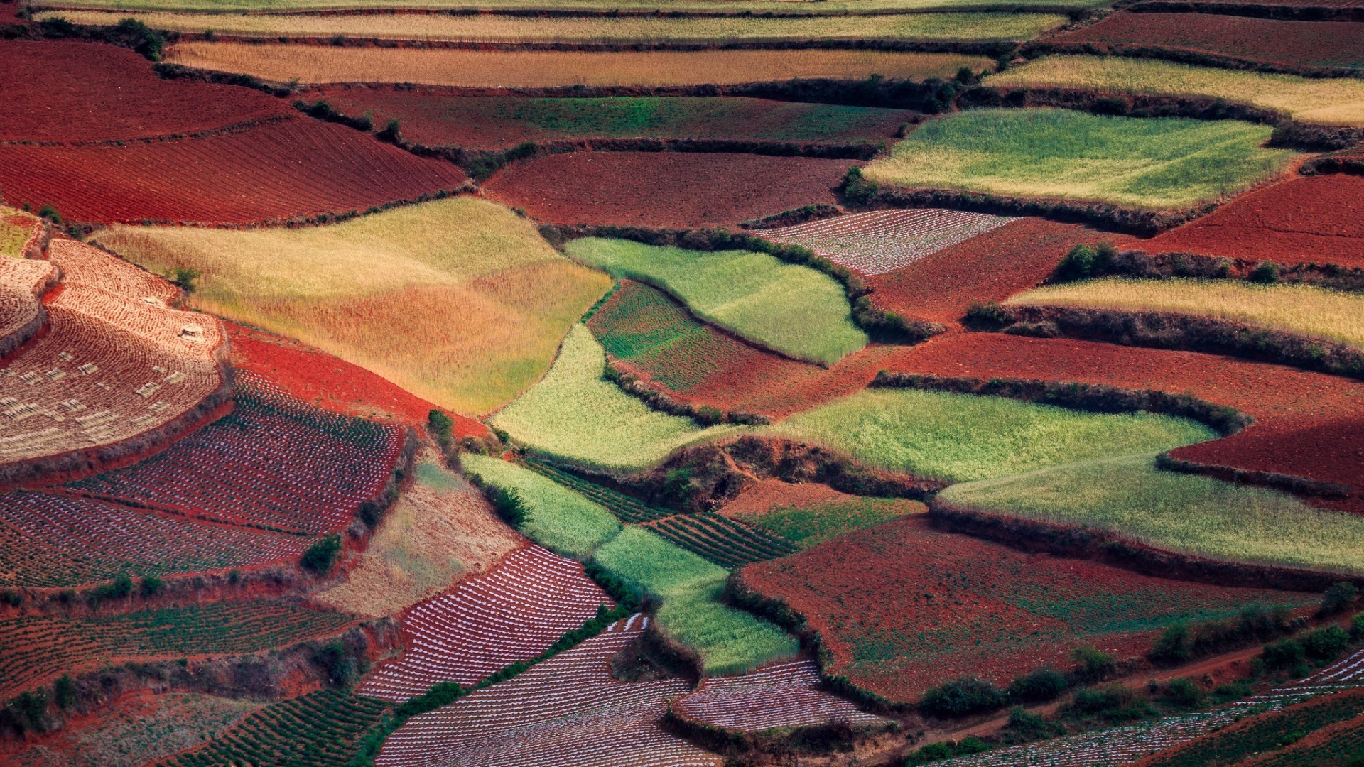 Bunte Herbstfarben der Pflanzfelder