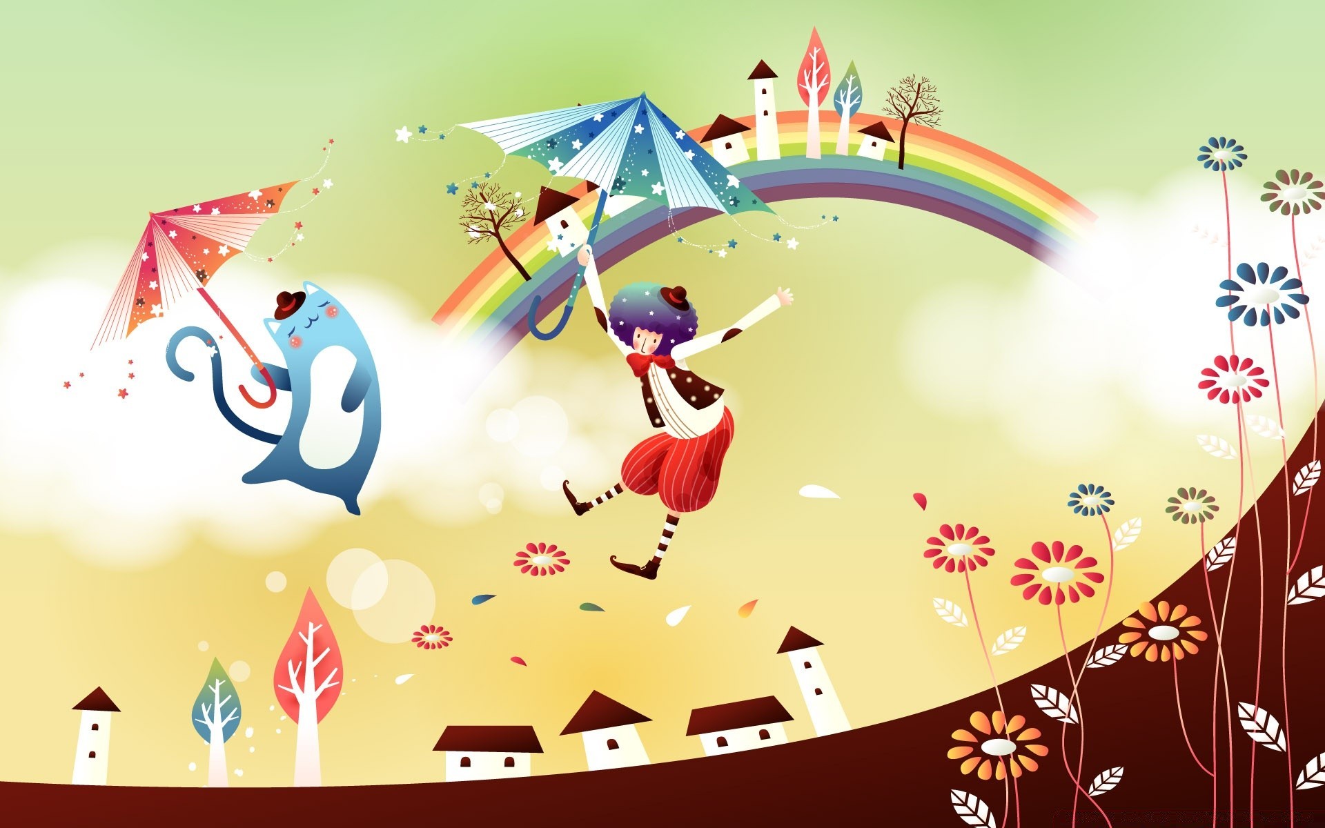 Cartoon-Grafik Zauberer und blauer Gegenpol mit Regenschirmen