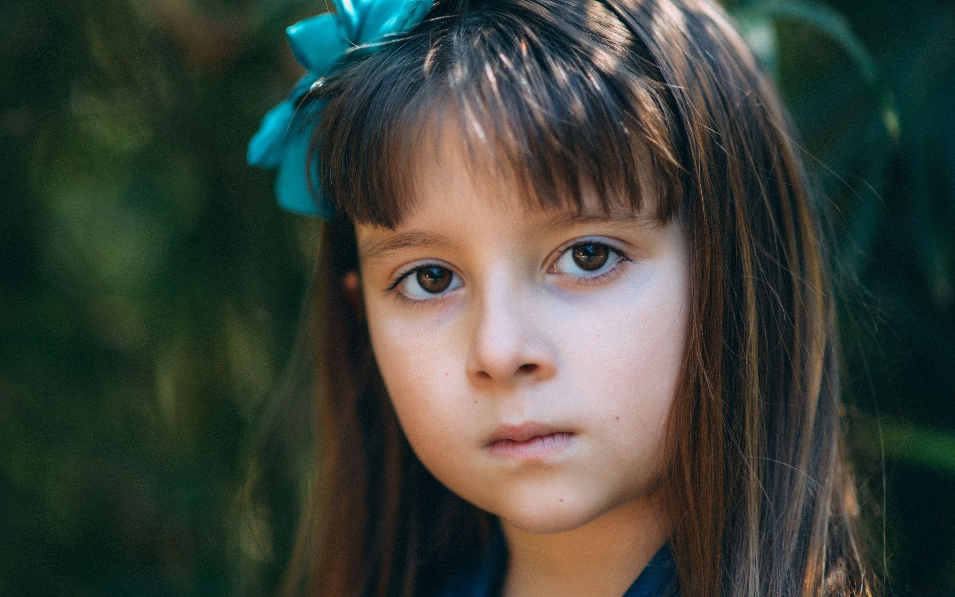Mädchen mit einer Blume im Haar auf dunklem Hintergrund