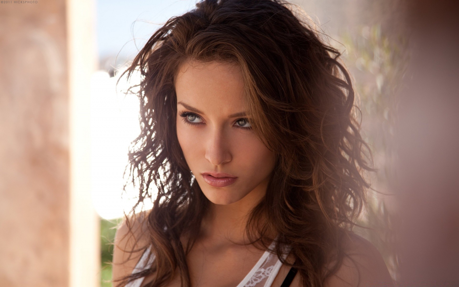 Brünette mit einer Blume im Haar in einem weißen pareo