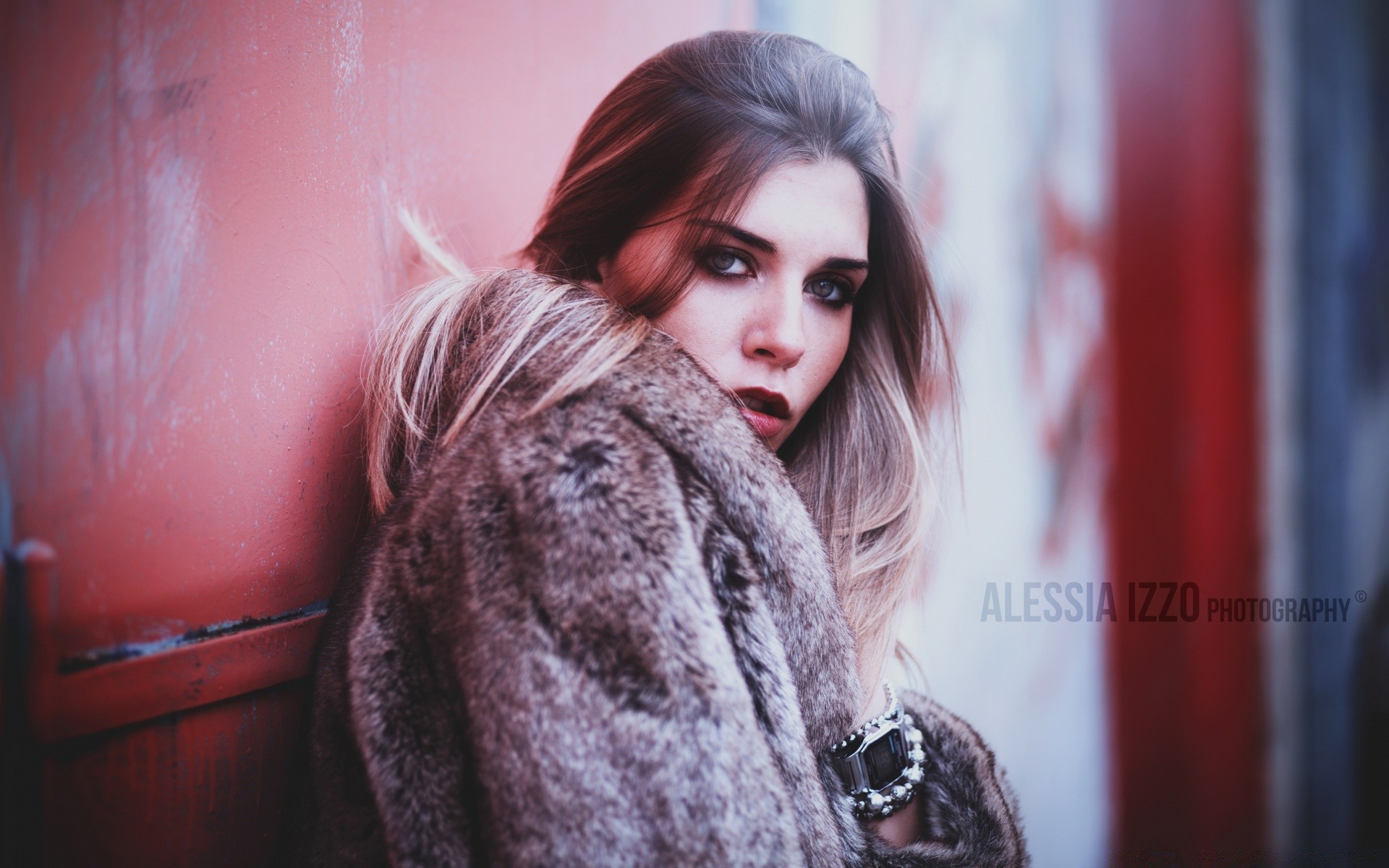 Porträt eines mädchens in einem pelzmantel an der wandPorträt eines Mädchens in einem Pelzmantel an der Wand