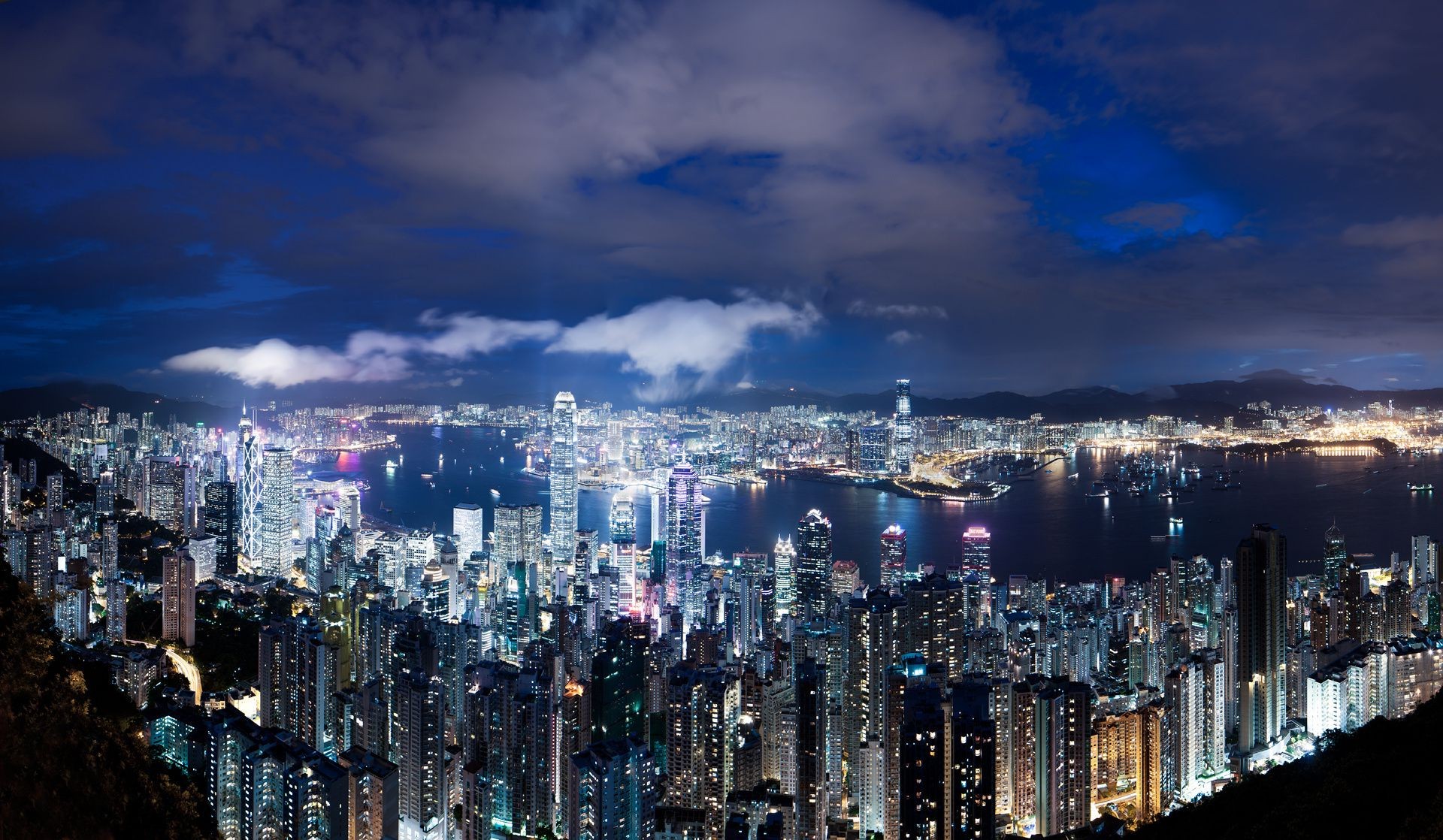 Ein schöner Lastkahn in den Strahlen der Nachtstadt