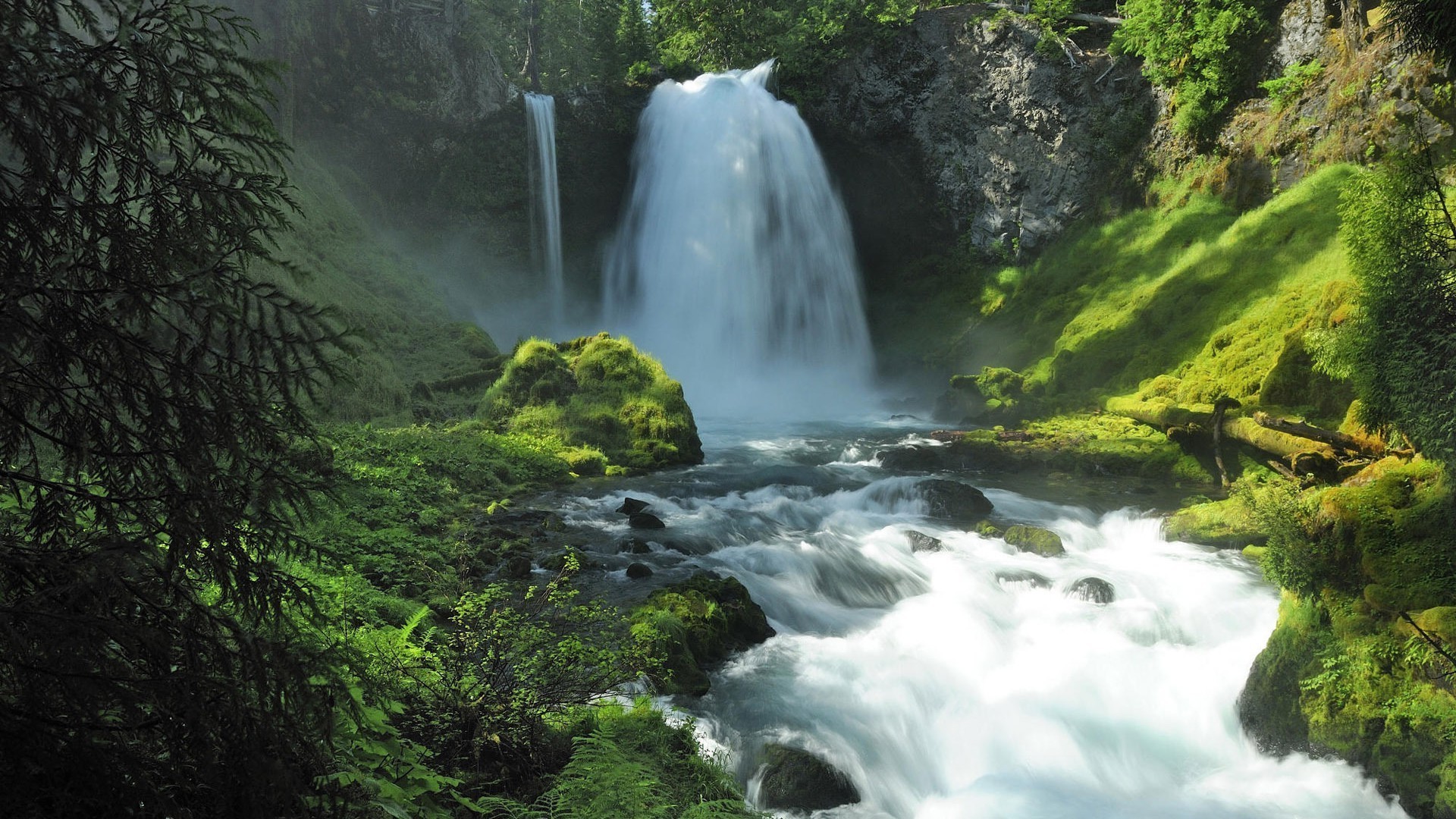 Ein foto mit einem transparenten teich unter den steinen auf dem hintergrund eines hohen nadelwaldes und der bergeEin Foto mit einem transparenten Teich unter den Steinen auf dem Hintergrund eines hohen Nadelwaldes und der Berge