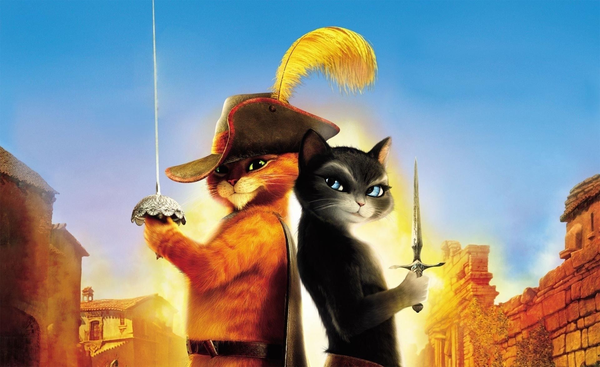 Zeichentrickfiguren Katze in Stiefeln. Hut mit Feder und Schwert