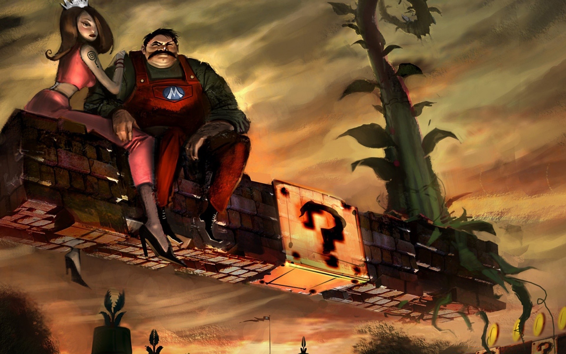 Helden des spiels mario blick auf den sonnenuntergangHelden des Spiels Mario Blick auf den Sonnenuntergang