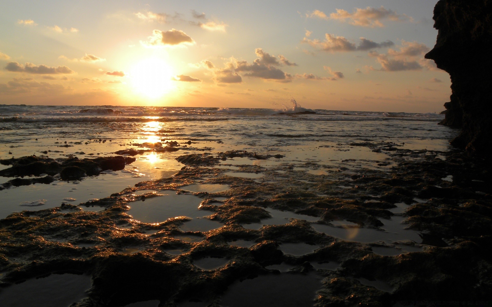 Strand am Meer bei Sonnenuntergang mit Sand in gelben Farben