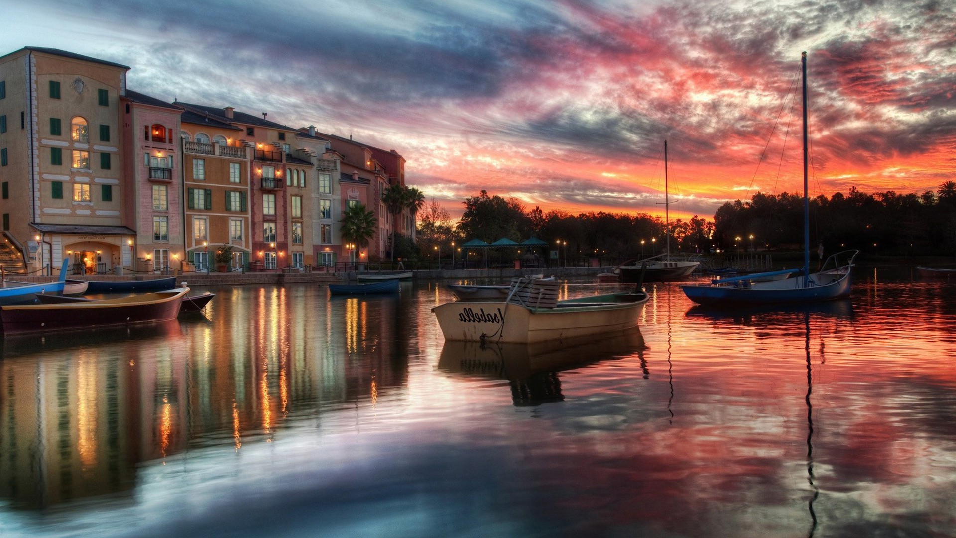 Der Sonnenuntergang spiegelt sich im städtischen Gewässer wider