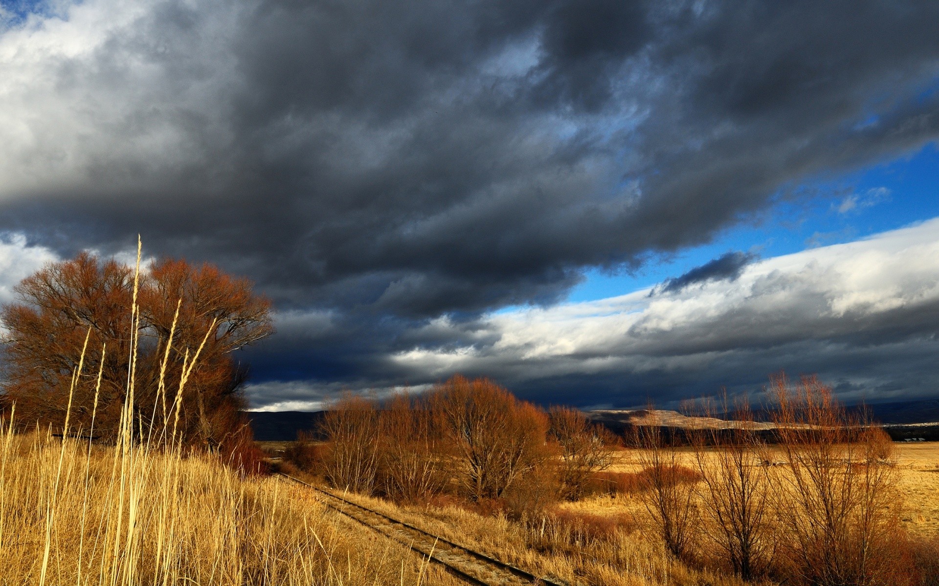 Ein gelbes Feld im Herbst und ein blauer Himmel unter Wolken